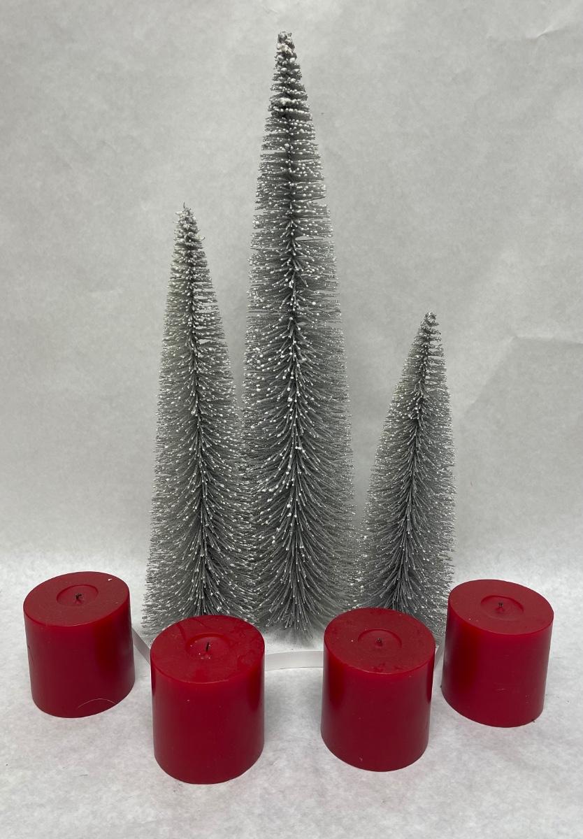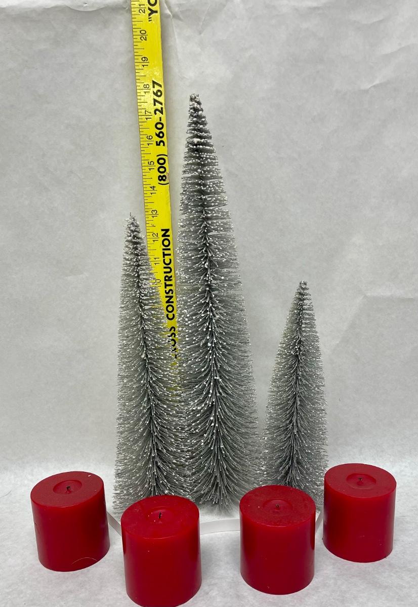 Christmas Decor Lot - 4 Red Candles and 3 Silvery Tabletop Trees