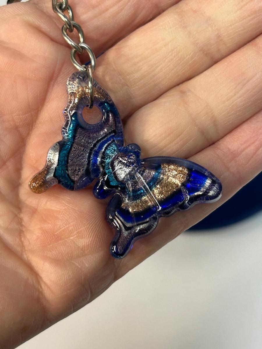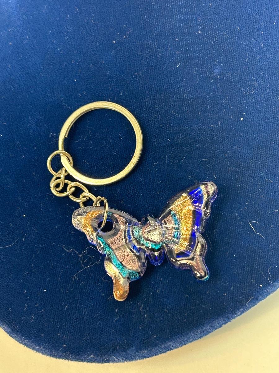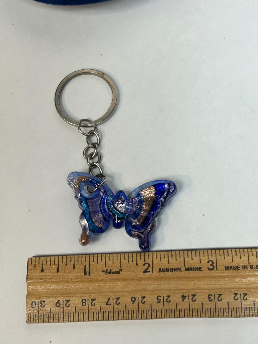 Blue and Gold Art Glass Butterfly Shaped Keychain. In good condition. Under 2" size.