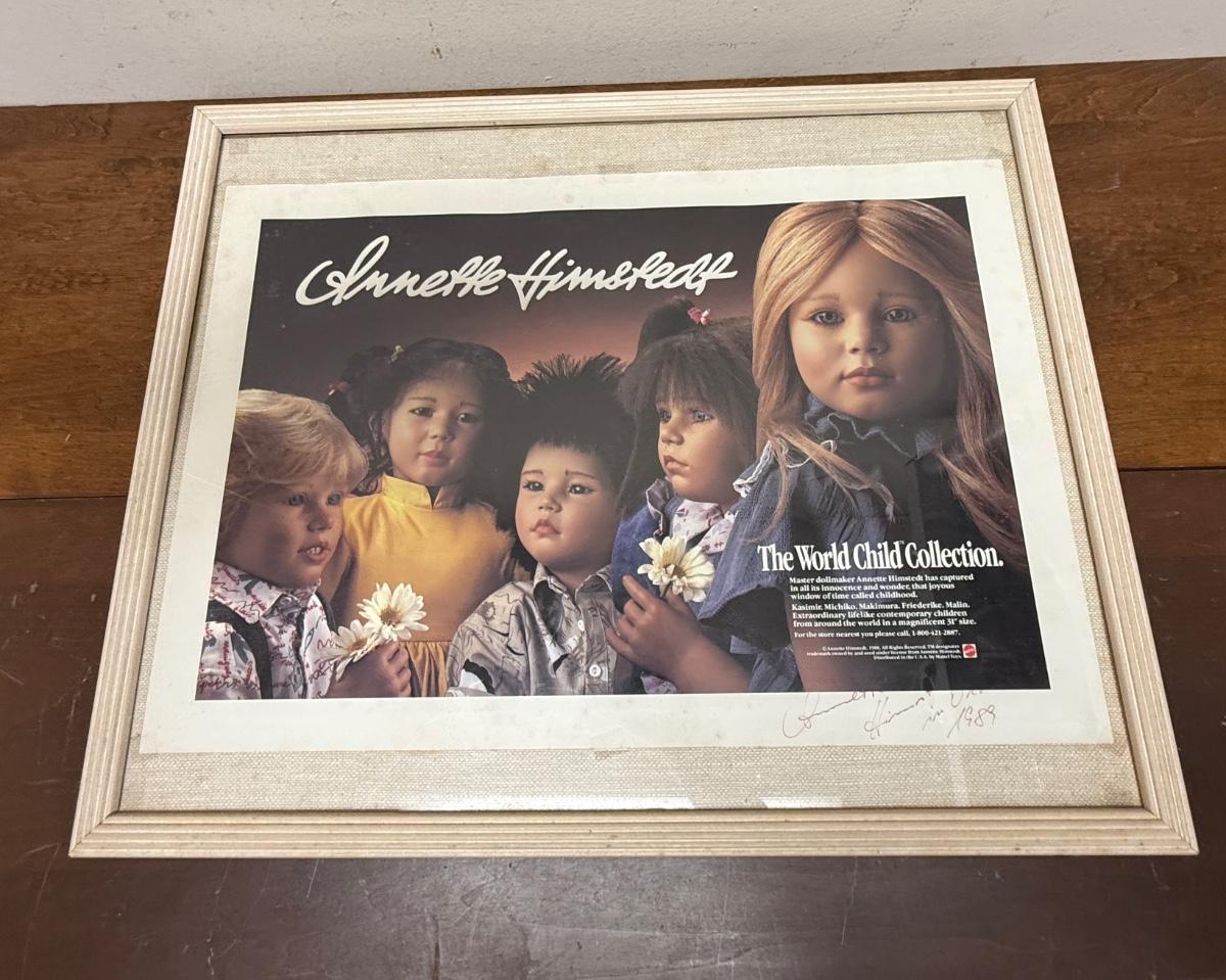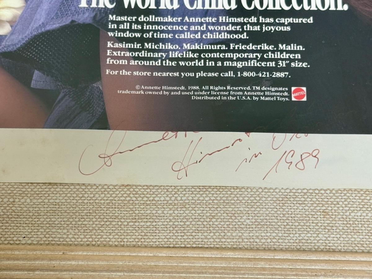 Advertising poster from 1988 showing Mattel Dolls designed bye Annette Himstedt. Signed in ink by the designer in 1989. Poster has been framed. Overall size is approx. 18" x 22".