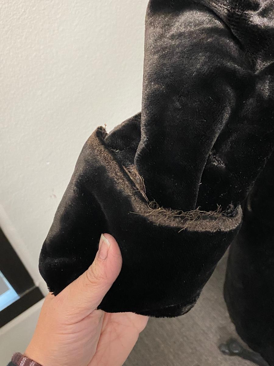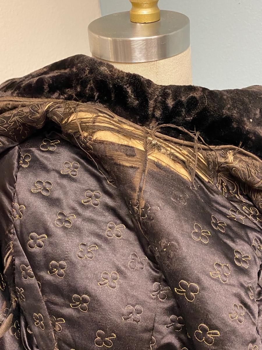 Vintage Antique Victorian Fitted Heavy Dark Brown Velvet Jacket Coat. Thick coat with pockets on the inside. There is light wear from age, along creases and with the buttons. Velvet does transfer a little when handling but not too bad. Lining where the sleeve meets body has torn inside. Fitted size 8.