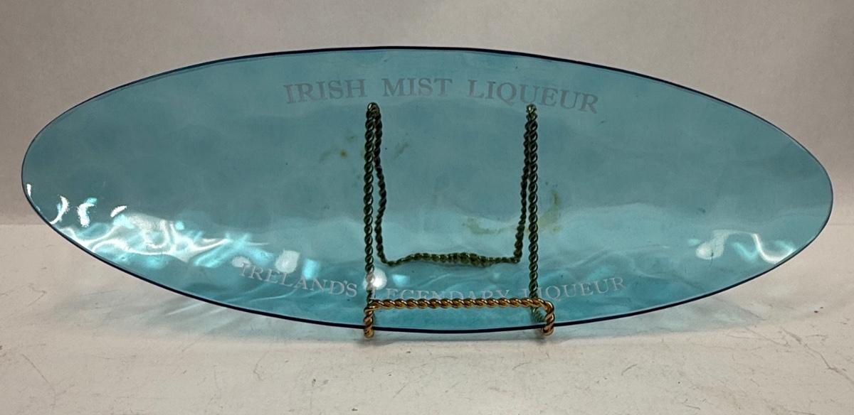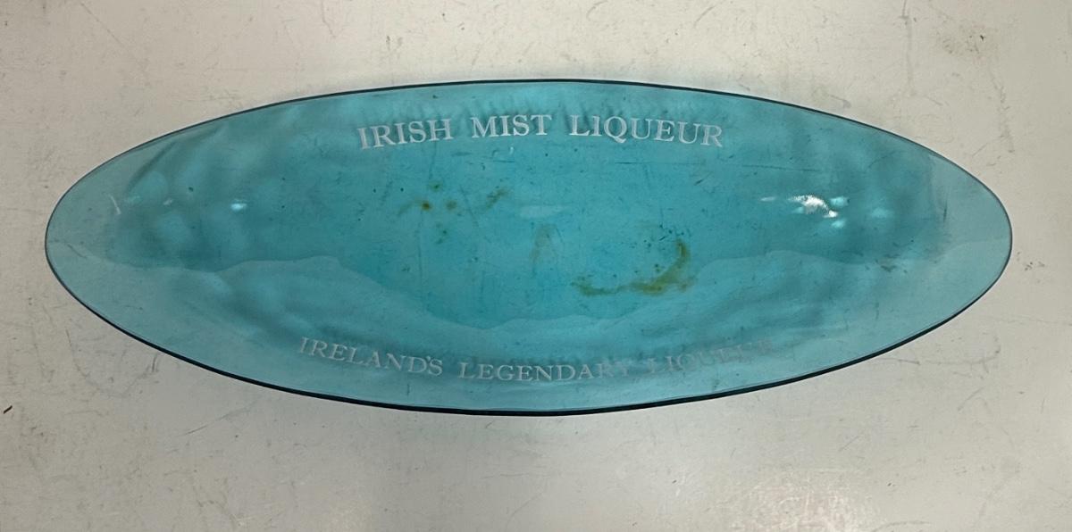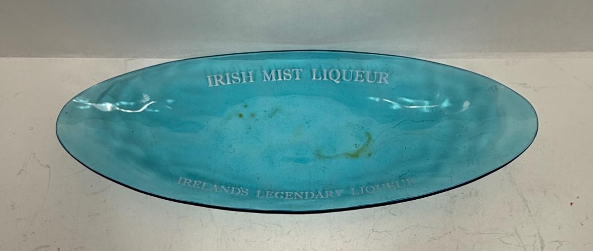 Aqua Blue Glass Oval Serving Dish says "Irish Mist Liqueur"