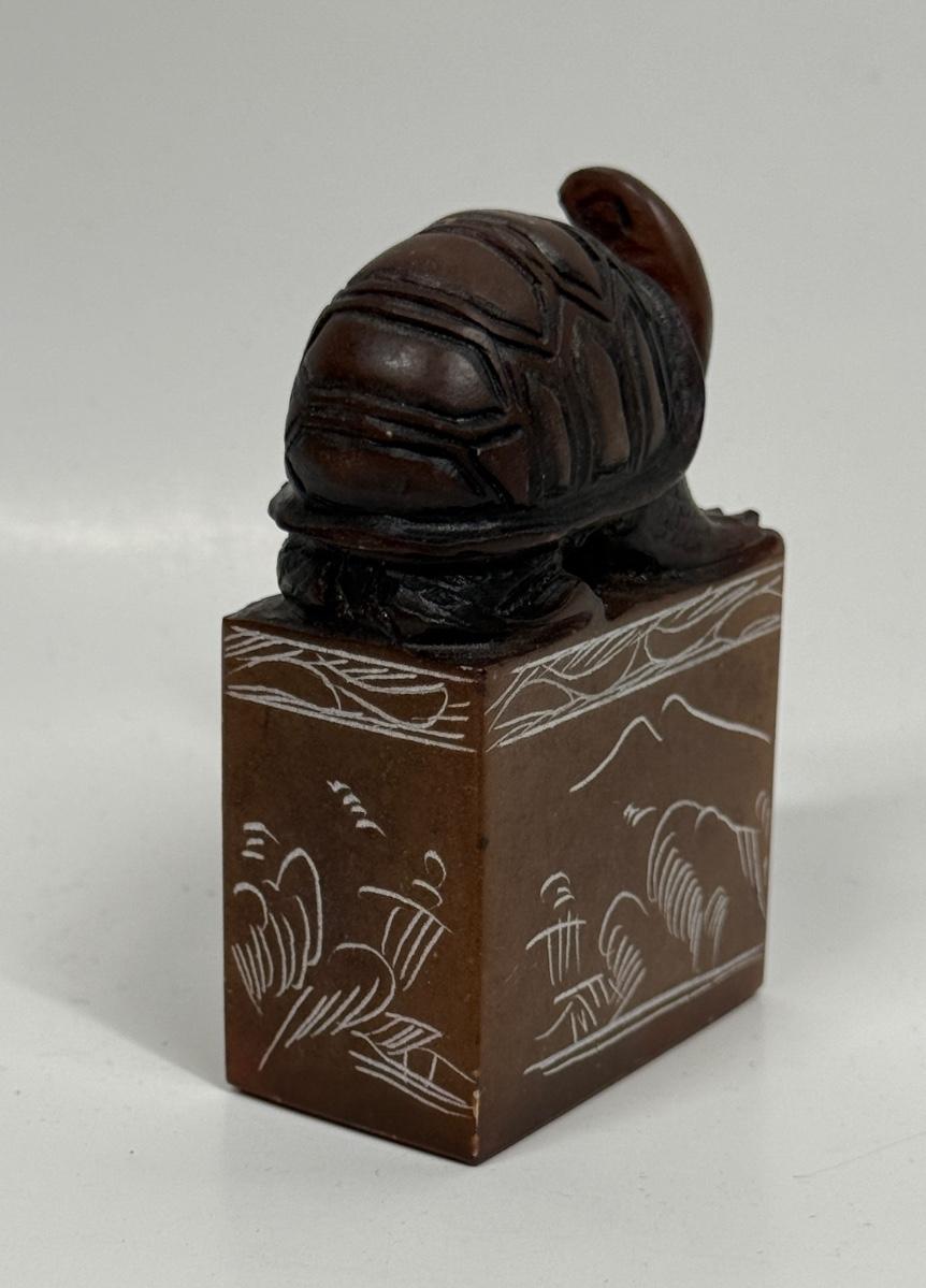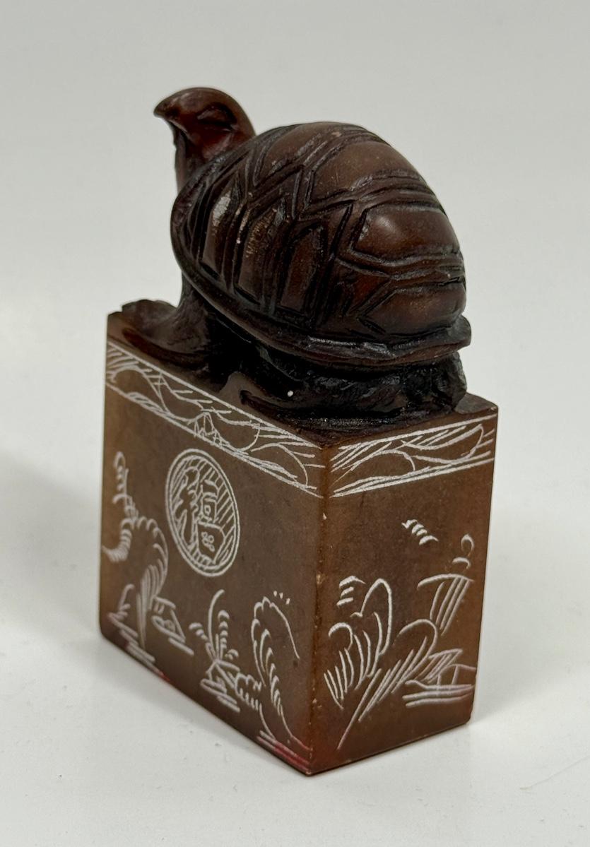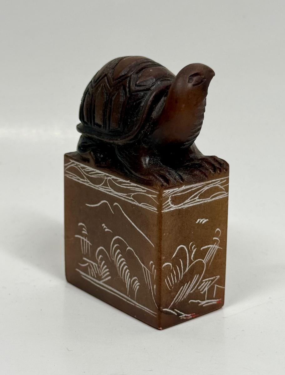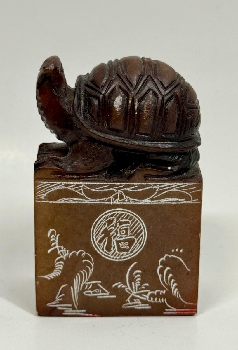 Used Chinese Soapstone Signed Carving Turtle, evidence of red ink on the bottom. Good condition, approx. 3" tall.