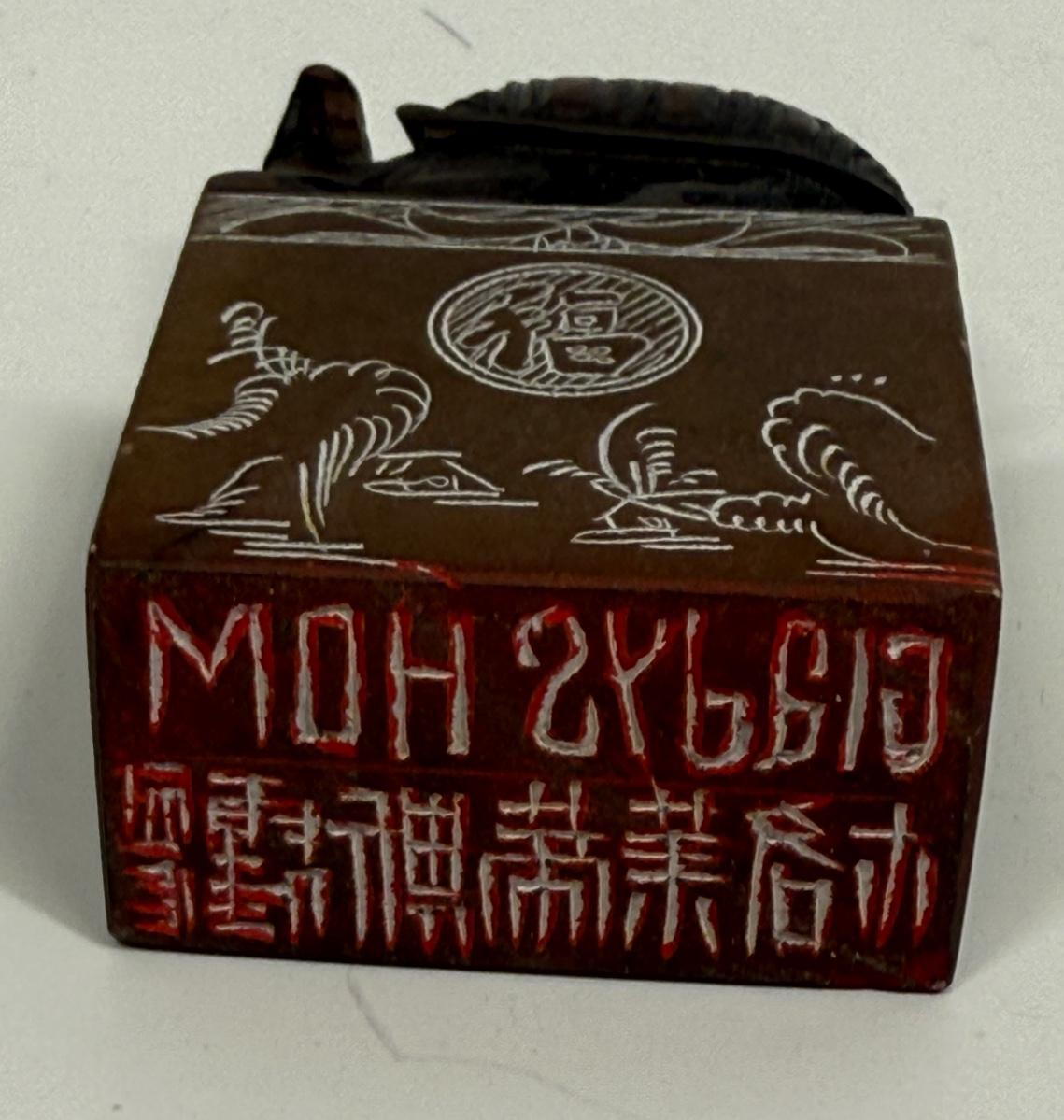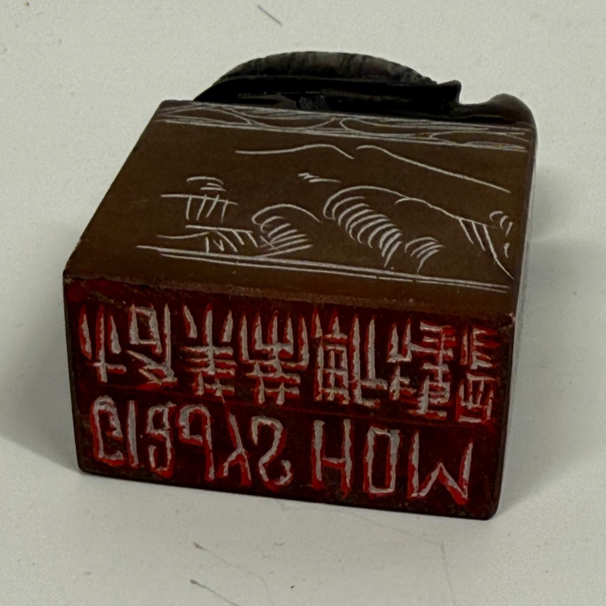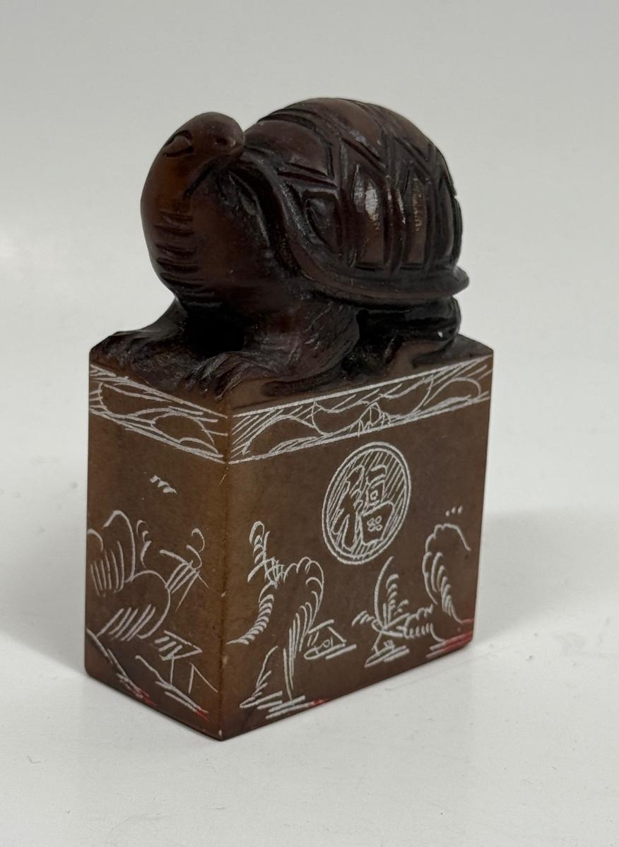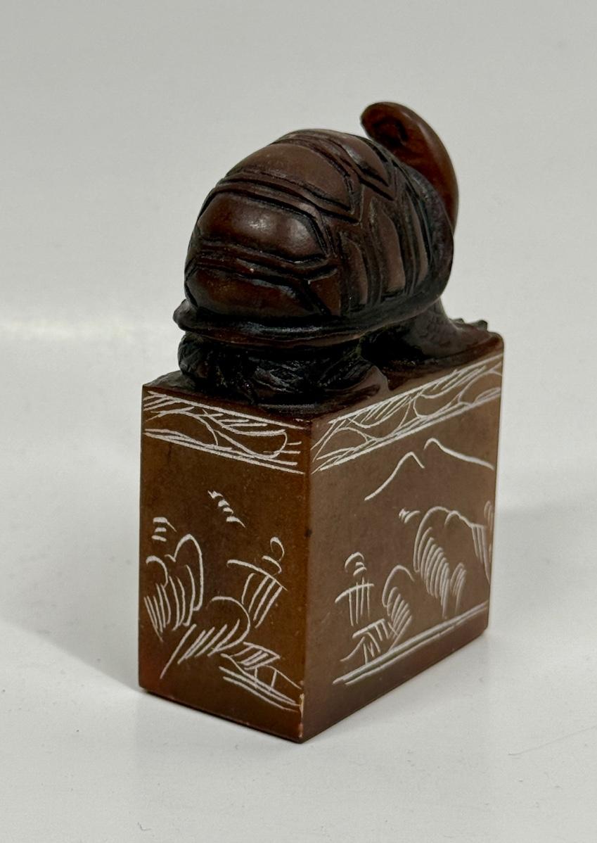 Used Chinese Soapstone Signed Carving Turtle, evidence of red ink on the bottom. Good condition, approx. 3" tall.