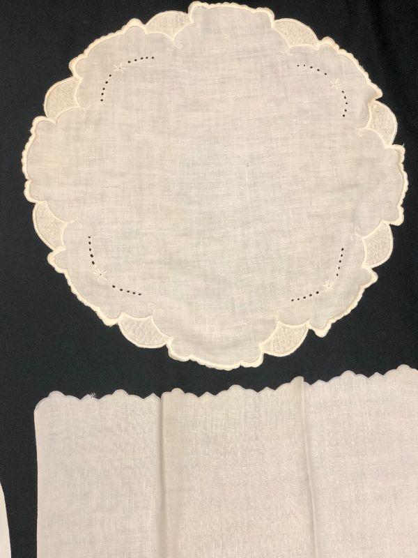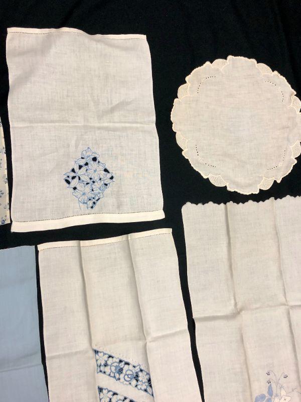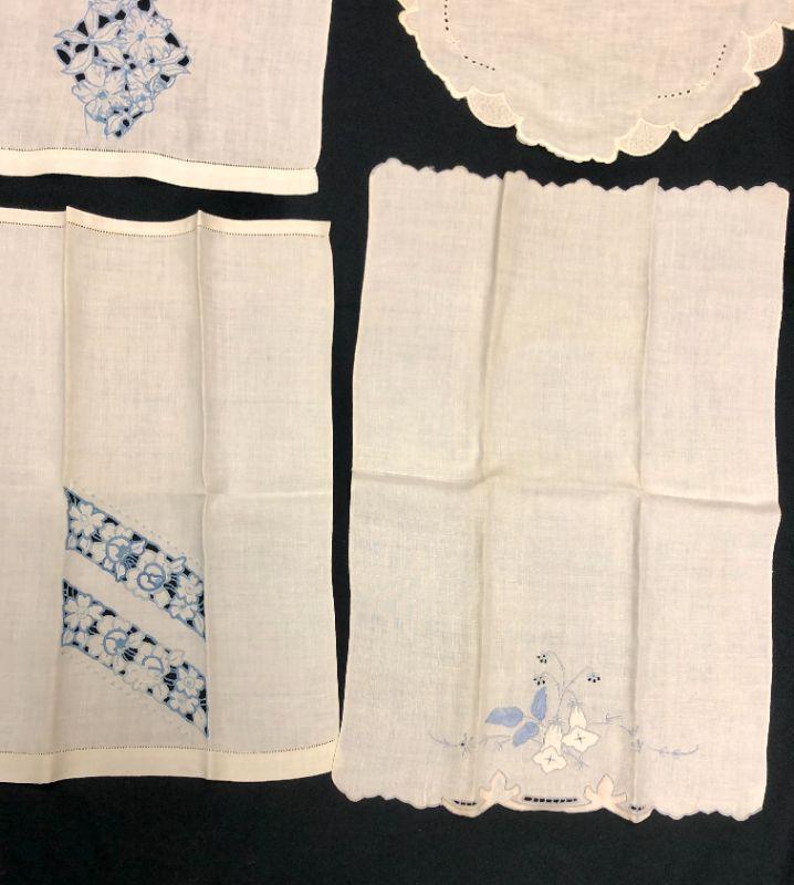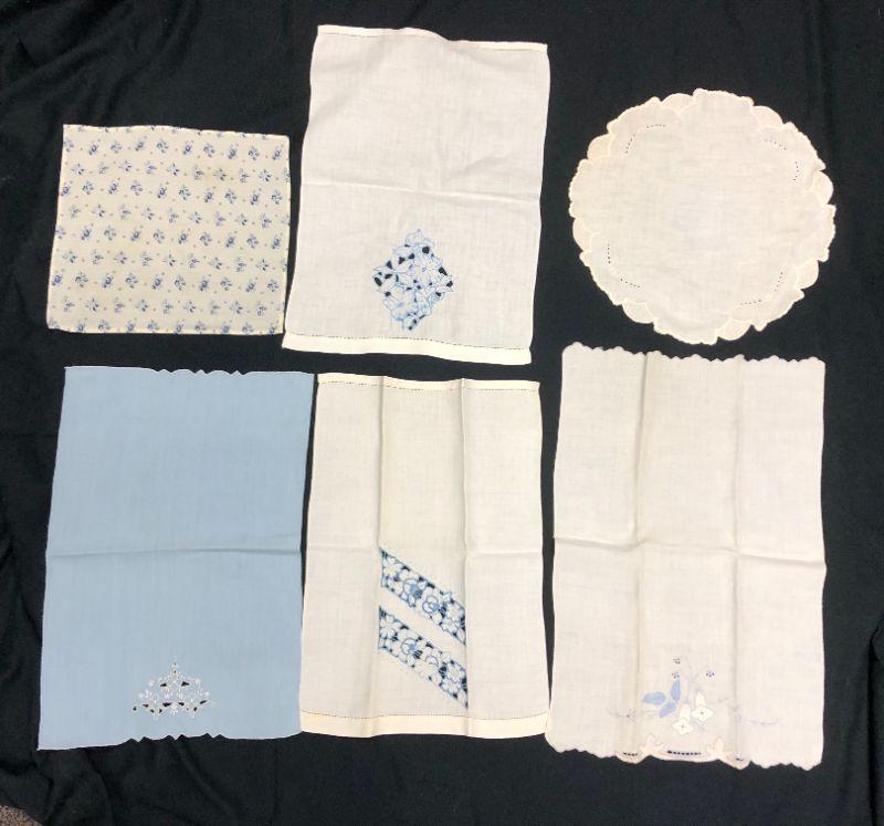 Lot of 6 embroidered items from top left to bottom right: 19”x13”, 22”x15”, 15” round doily, 12”x12”, 19”x13”, 20”x14”. Some light spots and discoloration from age/use. In fairly good condition otherwise.