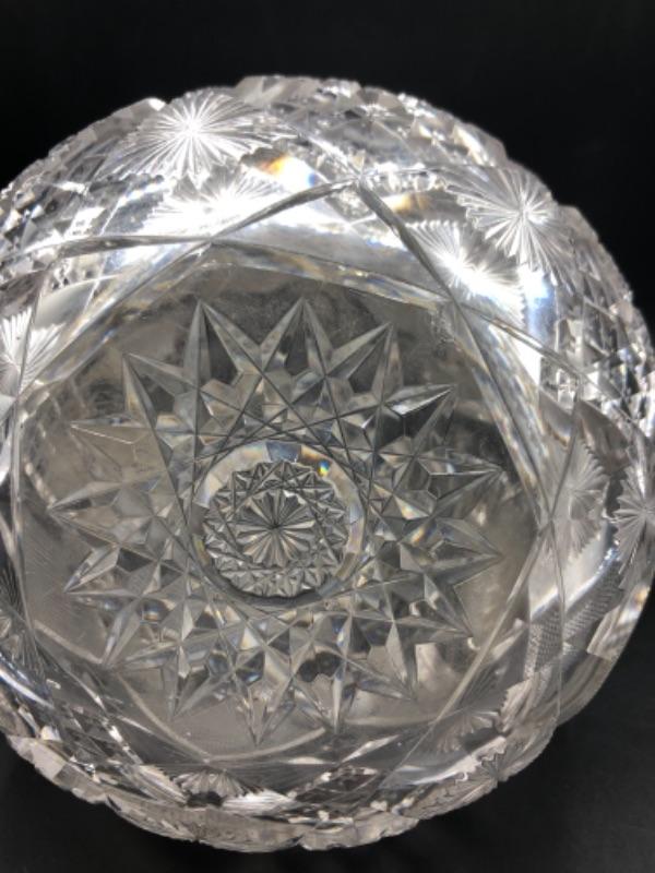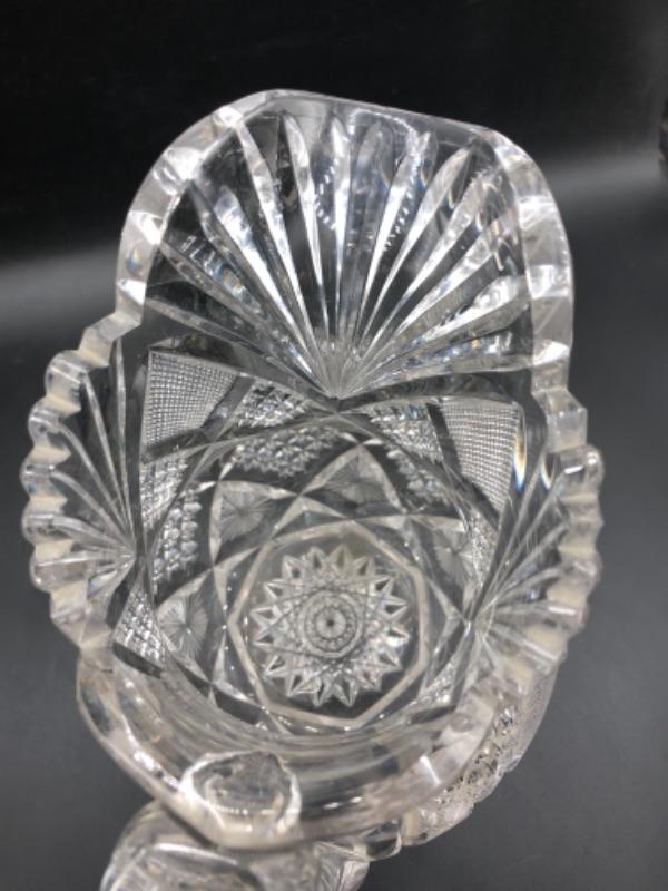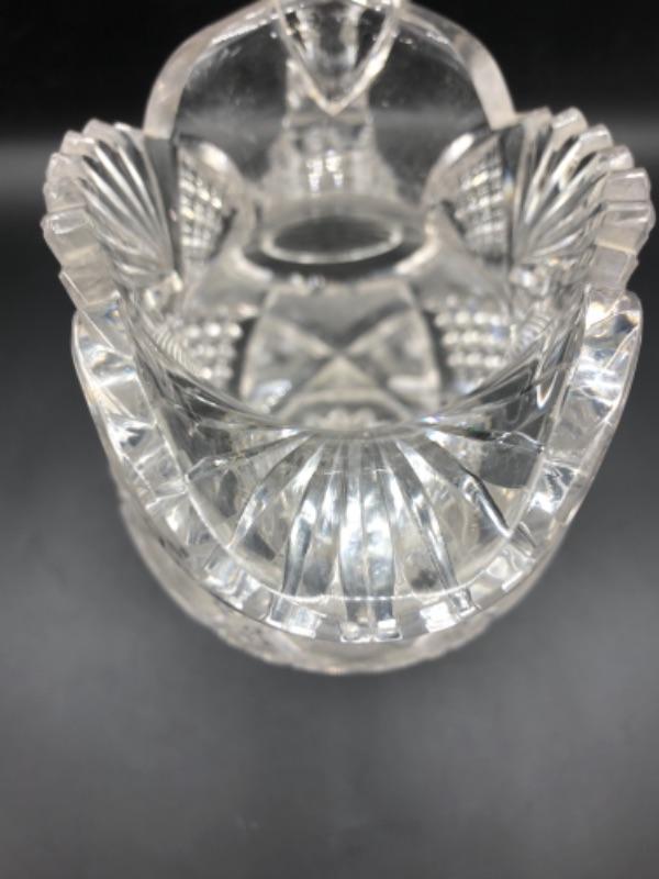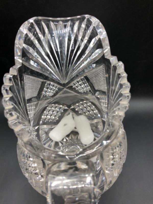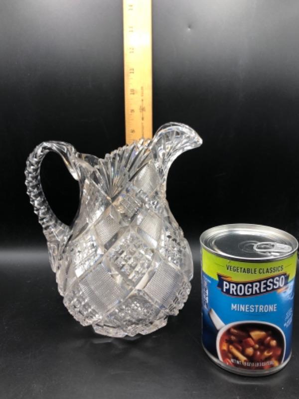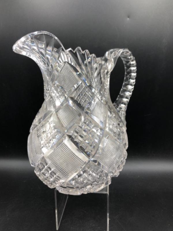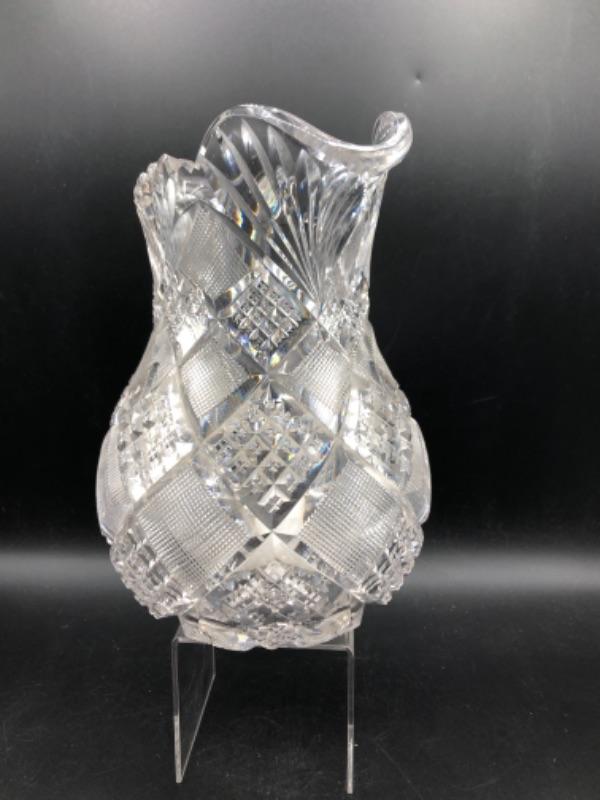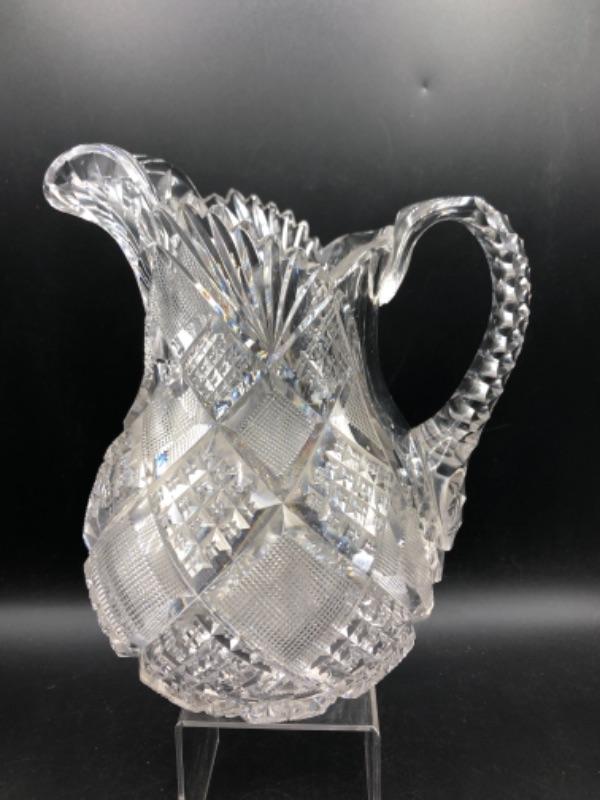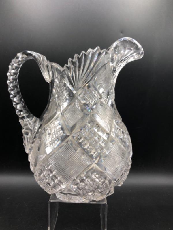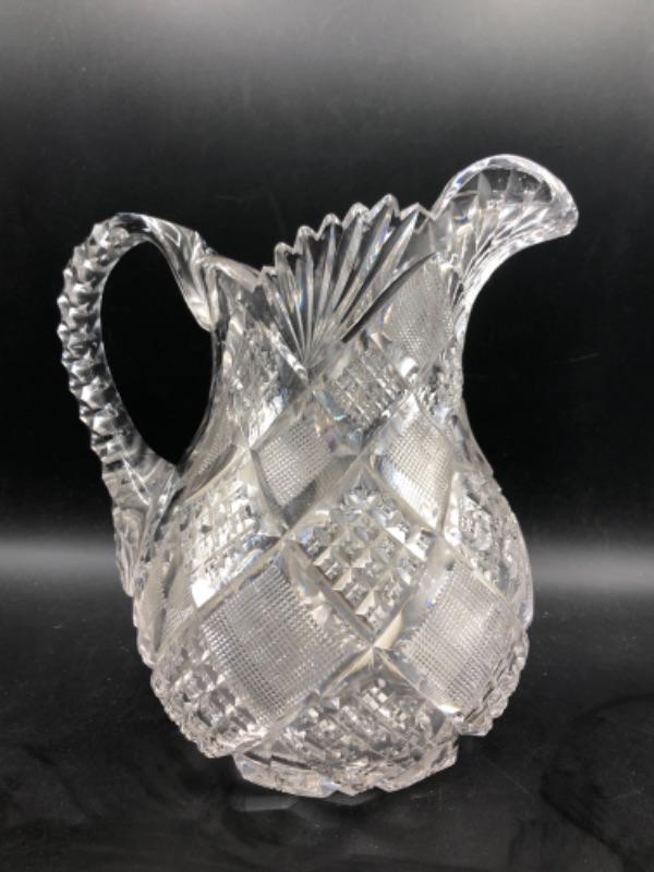 Beautiful diamond cut crystal water pitcher About 9" tall. Thick & heavy crystal.