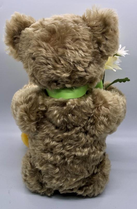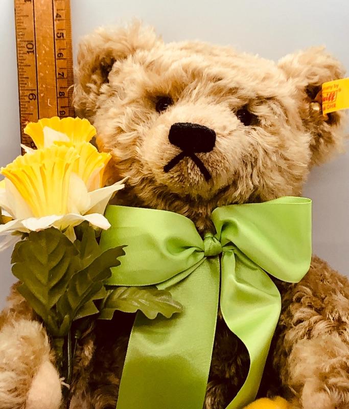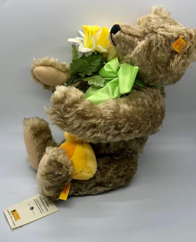 Collectible Steiff teddy bear growler (with voice) holding flowers, with a green bow tie ribbon and a spring chick. Excellent condition, all original tags attached.