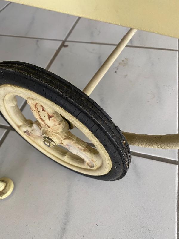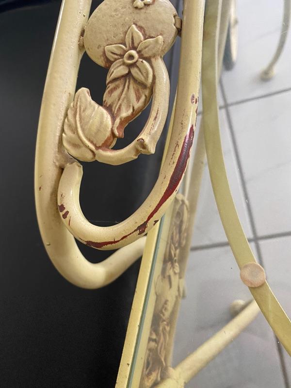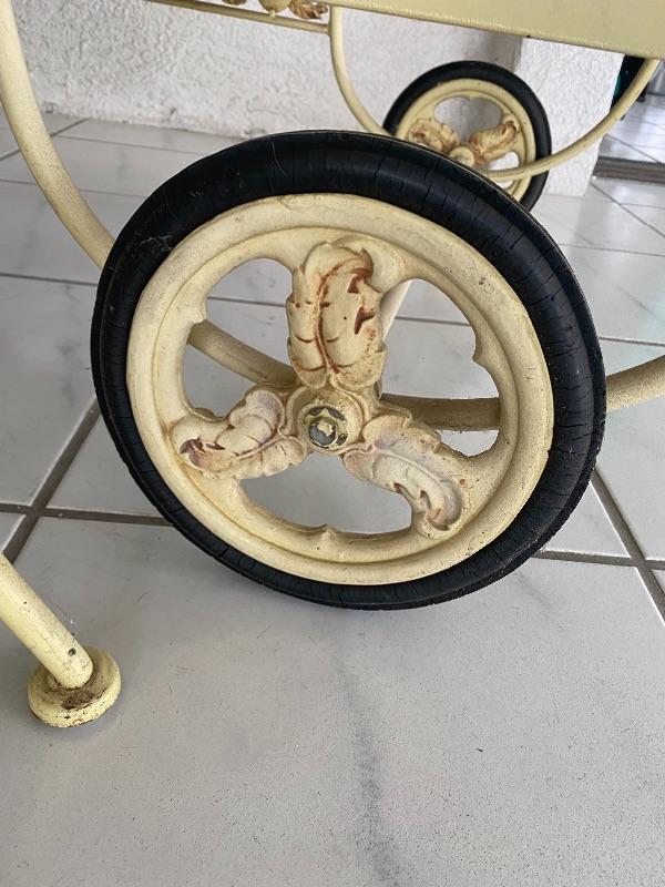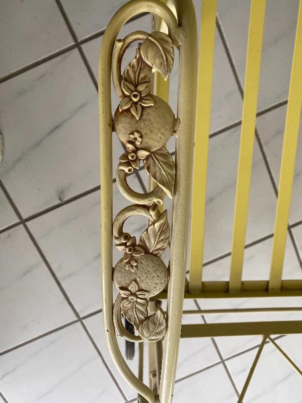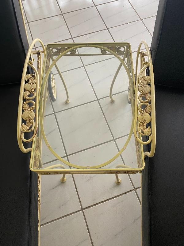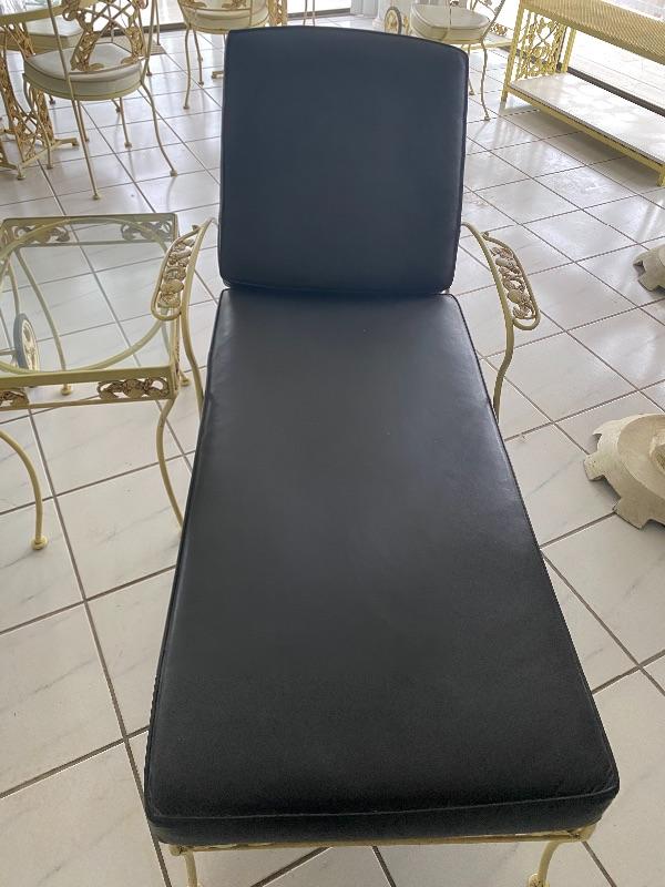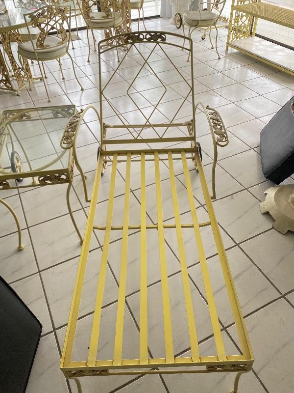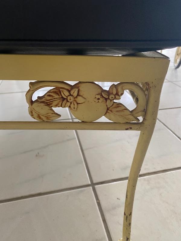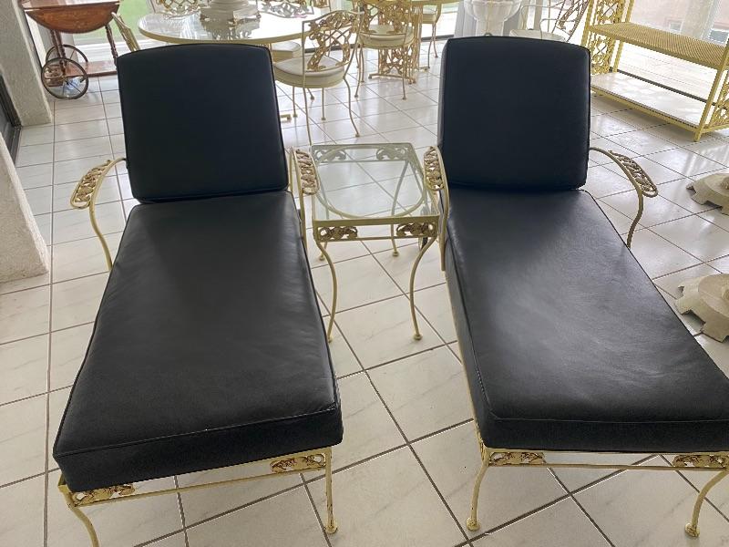 Vintage wrought iron lounge chairs. Citrus blossom pattern in pale yellow. Black cushions are in excellent condition. Come with a small glass top table. The wheels on the chairs do have cracking from age.