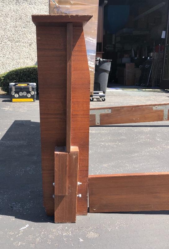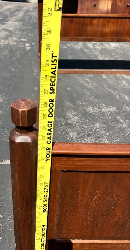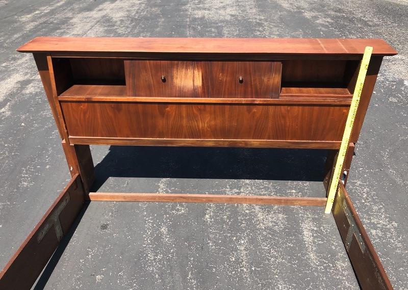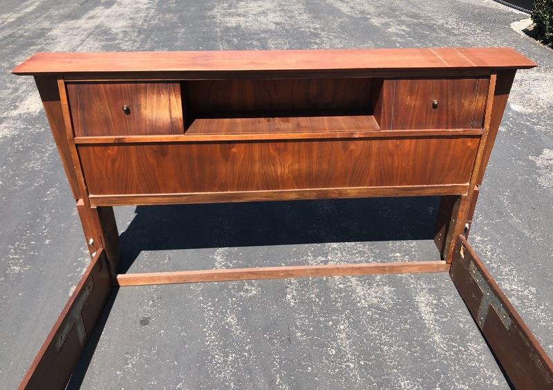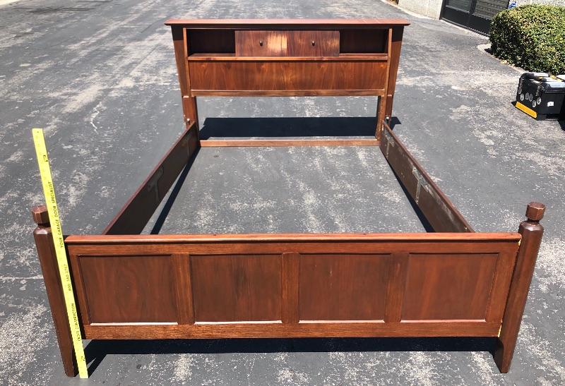 Vintage wood queen size bed frame. Headboard, footboard and rails. Headboard has storage with sliding doors.