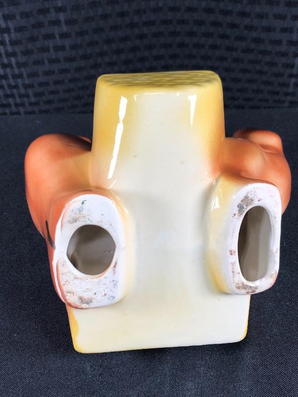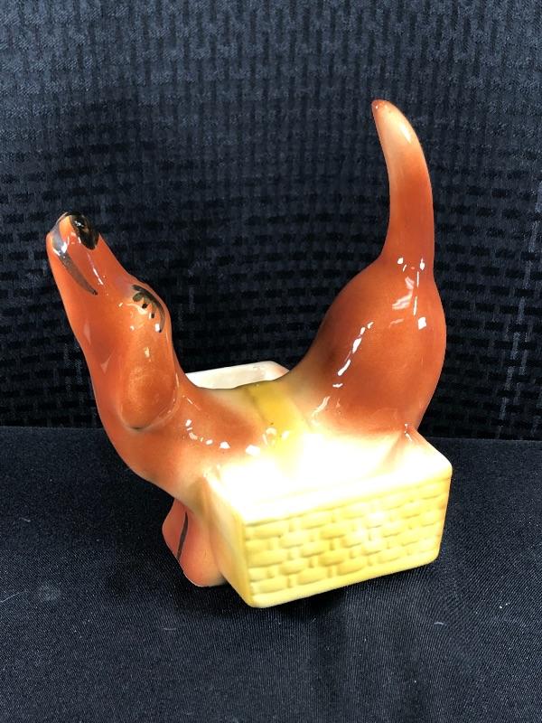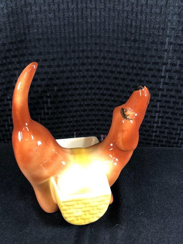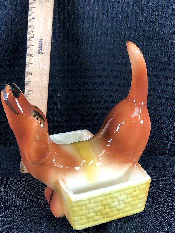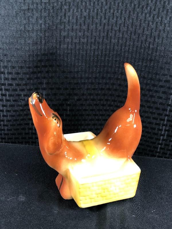 Vintage dachshund jewelry trinket dish. Basket on each side of dog. Good condition. Stands about 8".