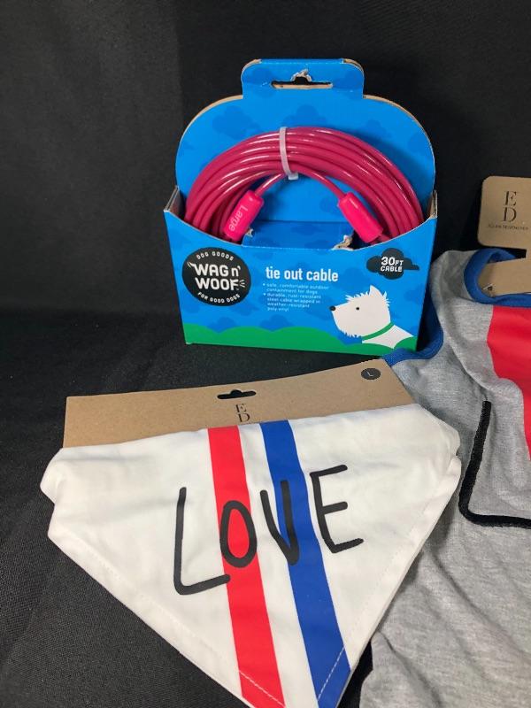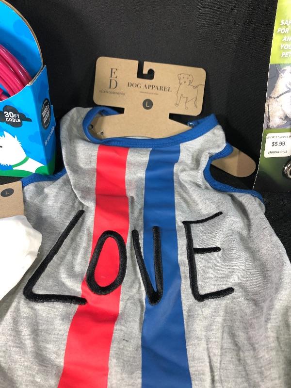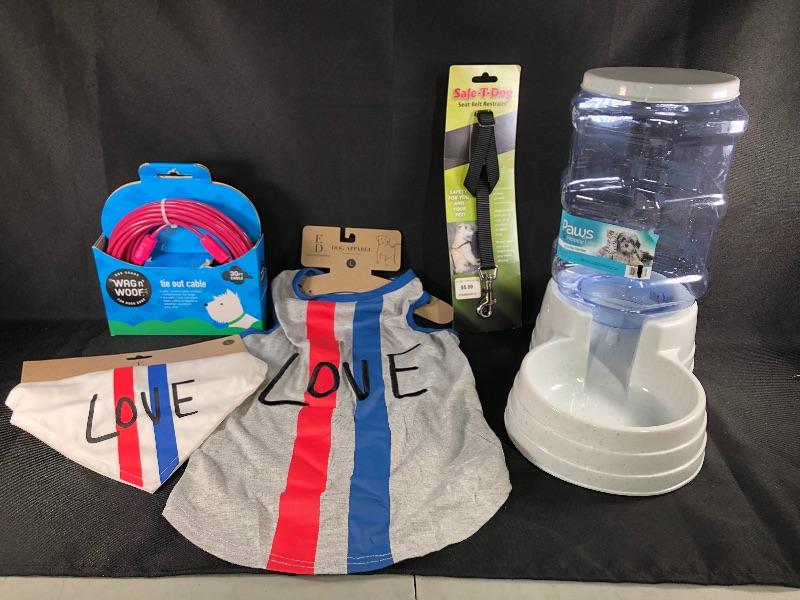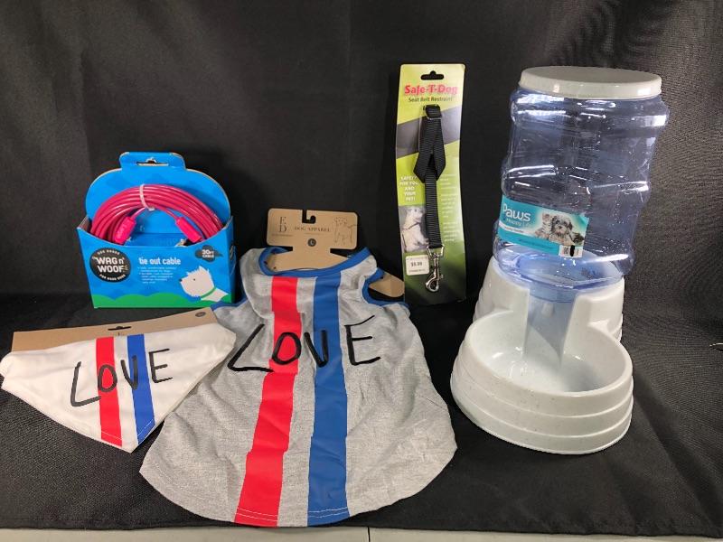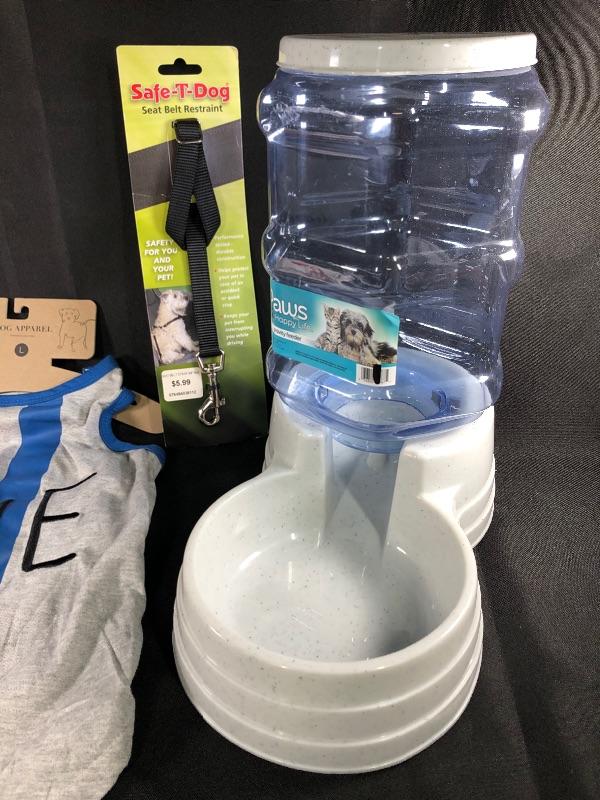 Small dog lot of items. NEW, Unused with Tags. Includes attire, feeder bowl, lead cable, and a seat belt restraint. #25-0009
