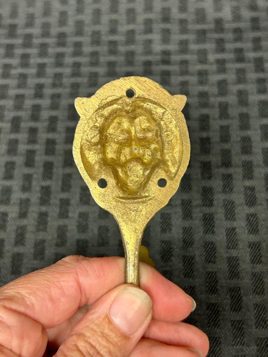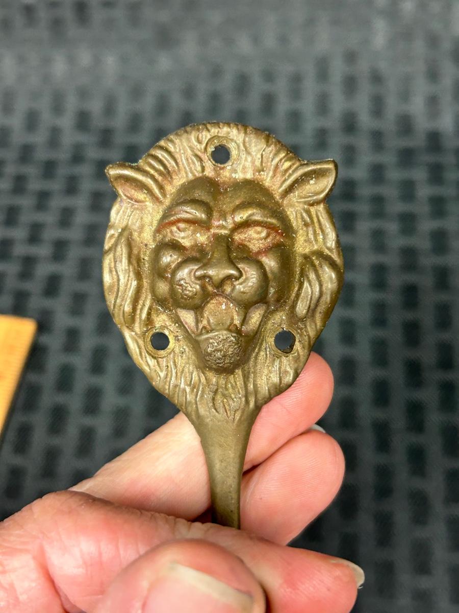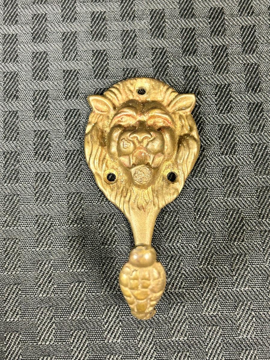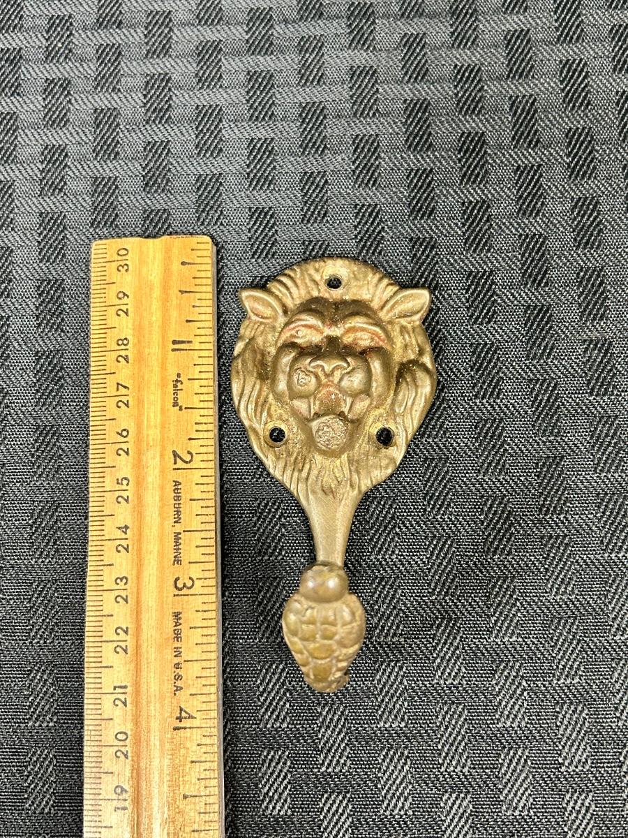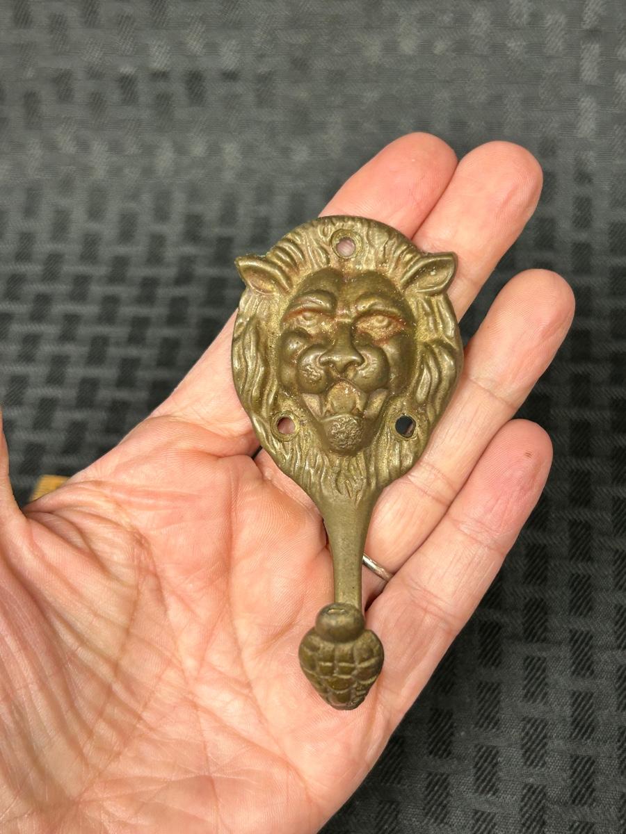 Vintage Brass Roaring Lions Head Wall Hanging Hook. In good condition. Under 4" length.
