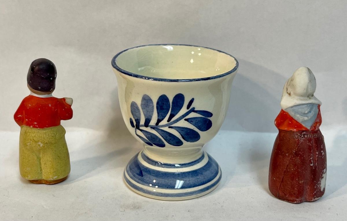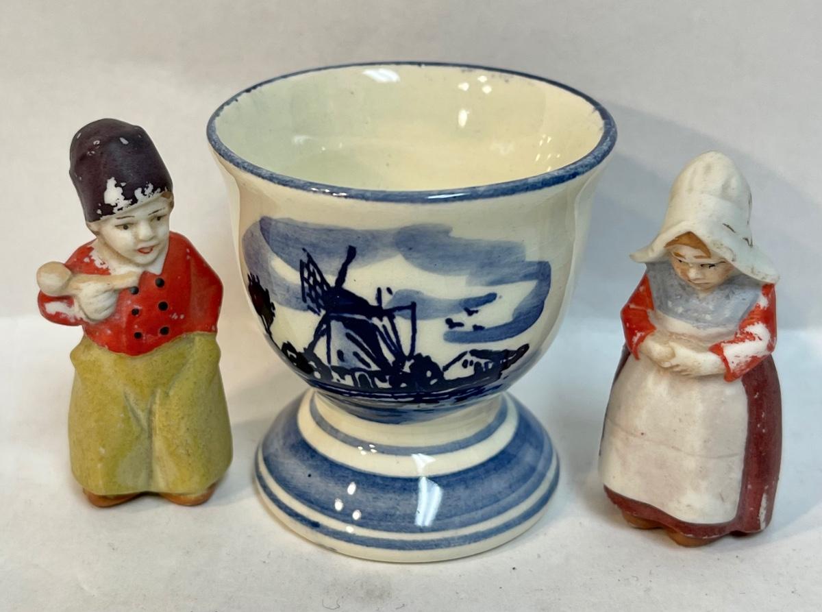 3 piece lot of 2 figurines and 1 egg cup. These are in good condition considering their age. The figurines have suffered some paint loss. and the cup is a little crazed.
