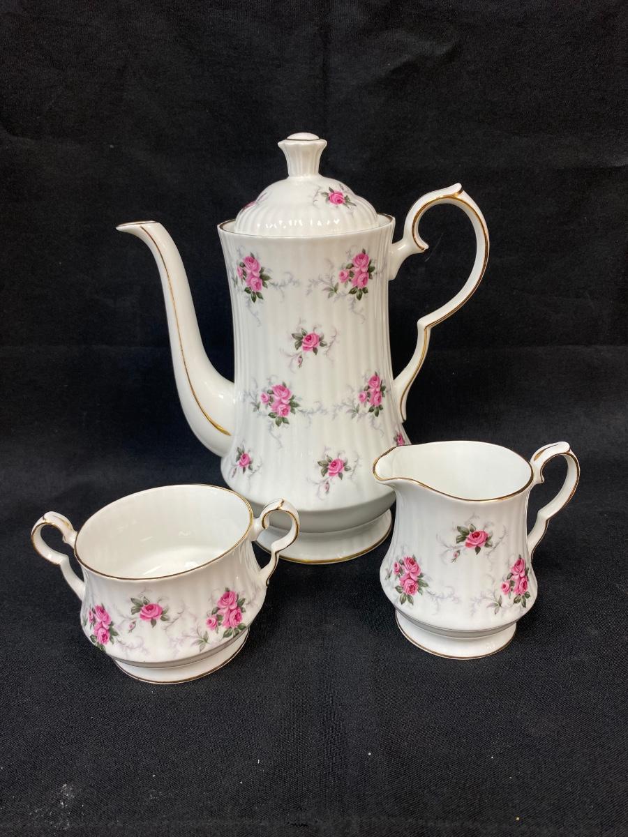 Vintage Princess House Exclusive Hammersley Fine Bone China Pink Rose Flower Teapot with Cream and Sugar. In very good condition.