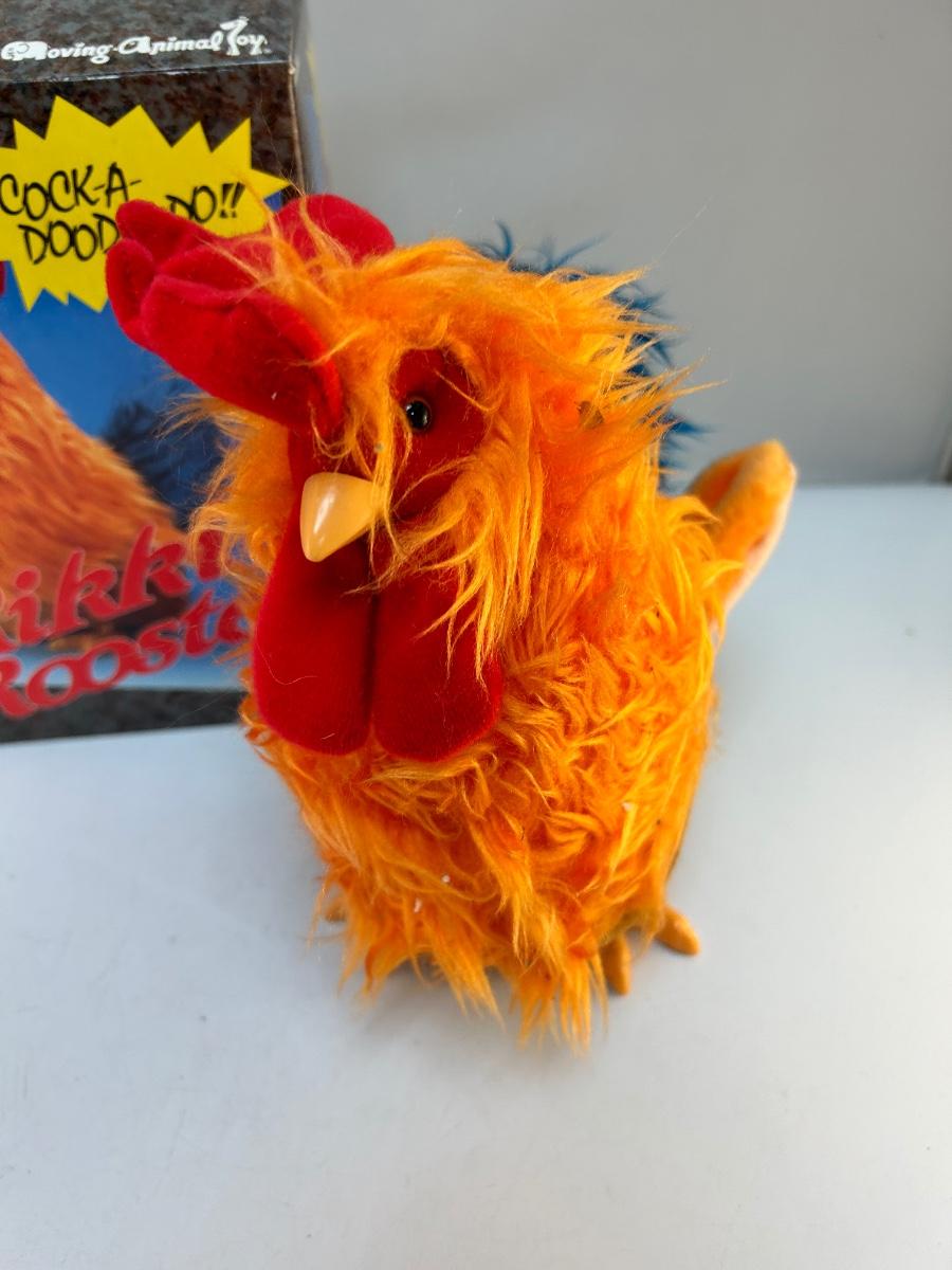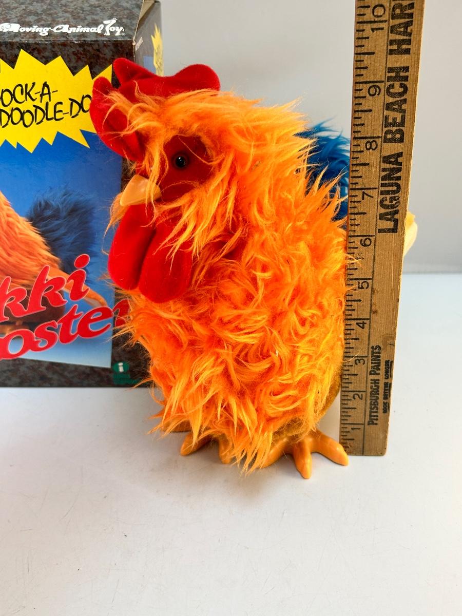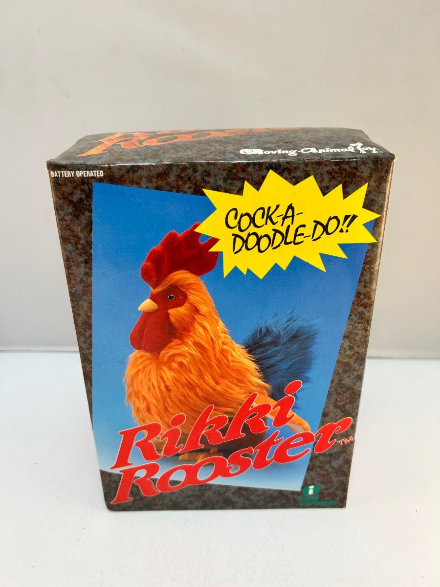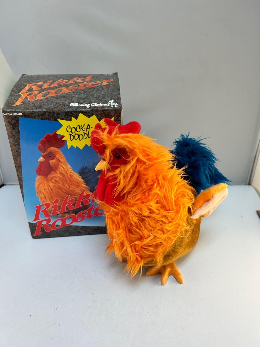 Retro Vintage Animatronic Battery Operated Plush Fuzzy Rikki Rooster Moving Animal Toy. In good condition. Comes in original box. Has not been tested with batteries but the battery terminal is clean. About 9" size.