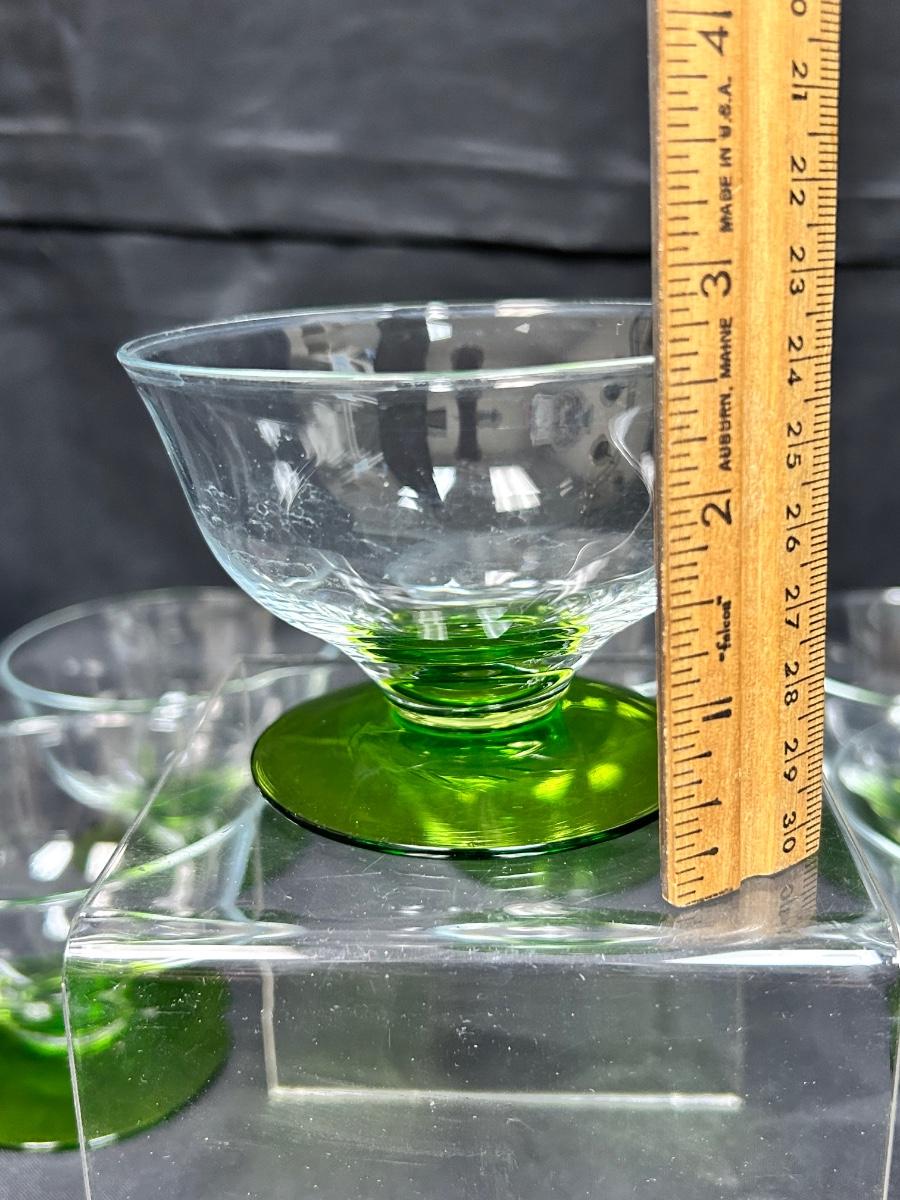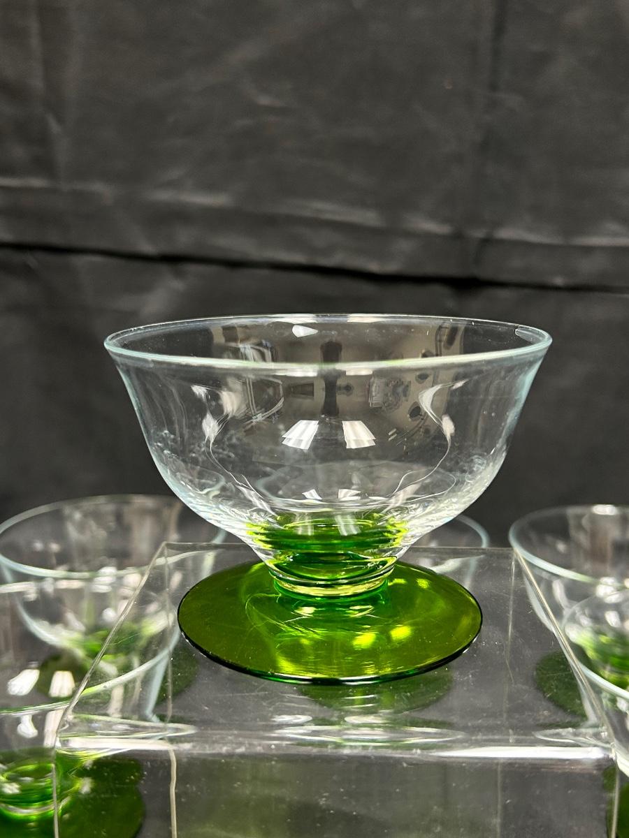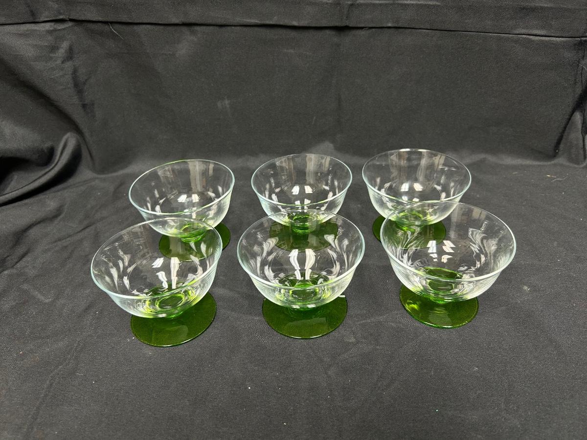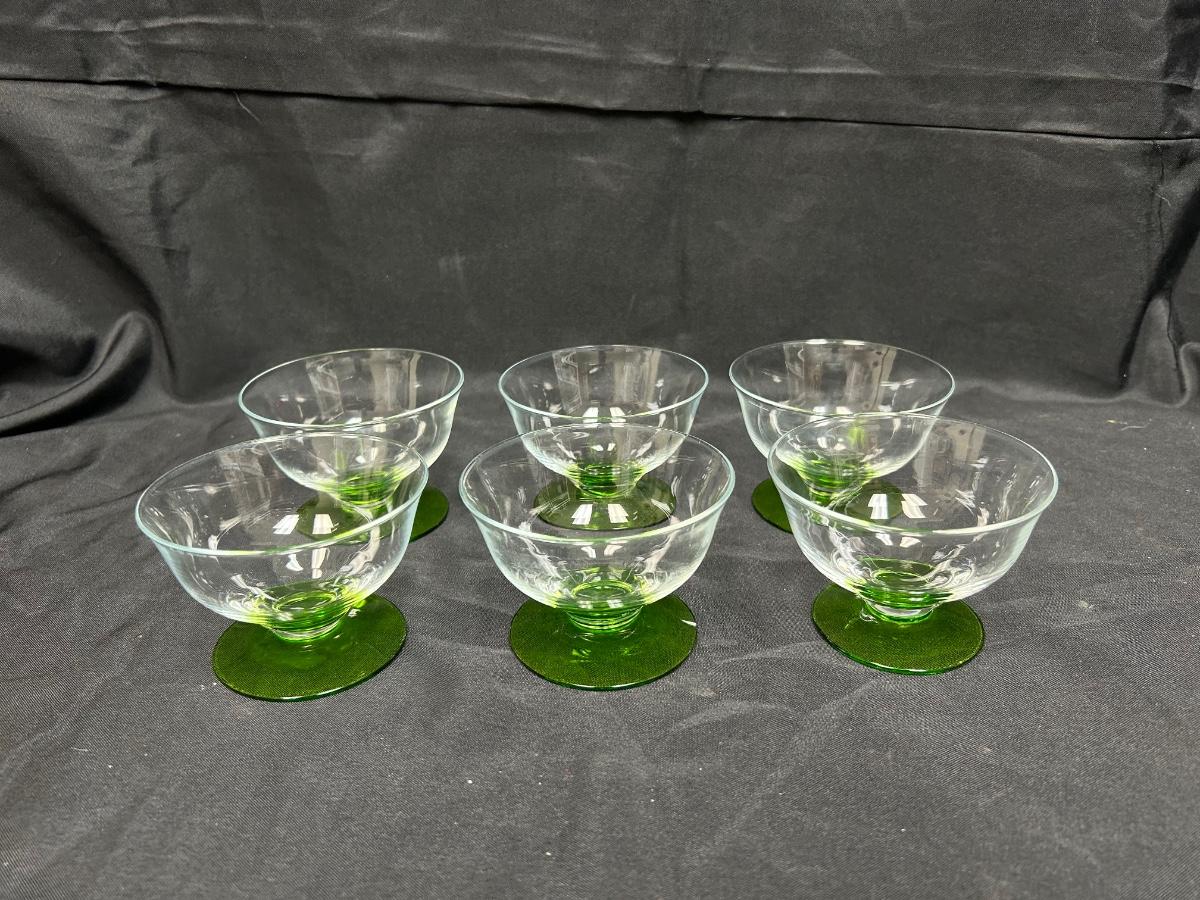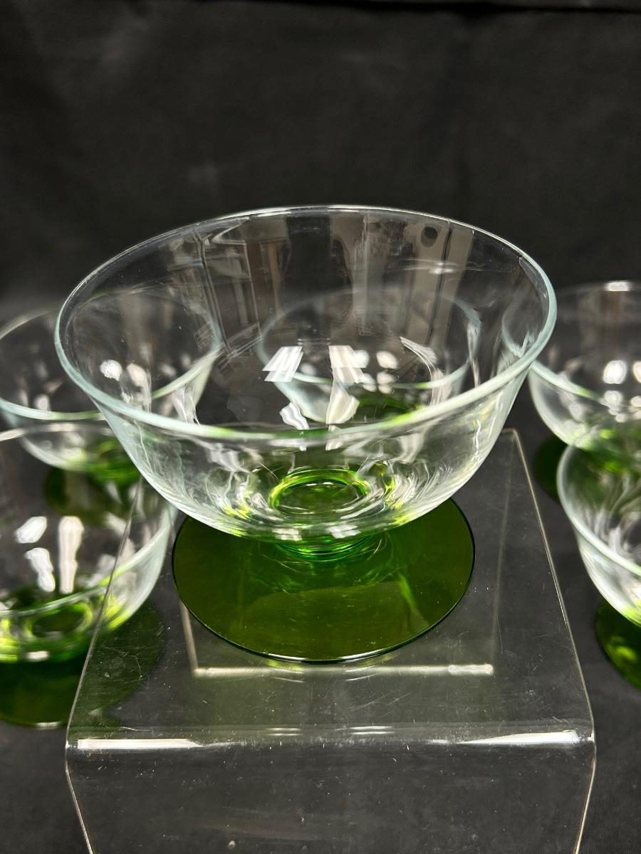 Set of 6 Green Glass Footed Berry Ice Cream Dessert Bowl Dishes. Clear bowl with green glass foot. Not vaseline glass, we checked. All pieces in good condition, no chips.