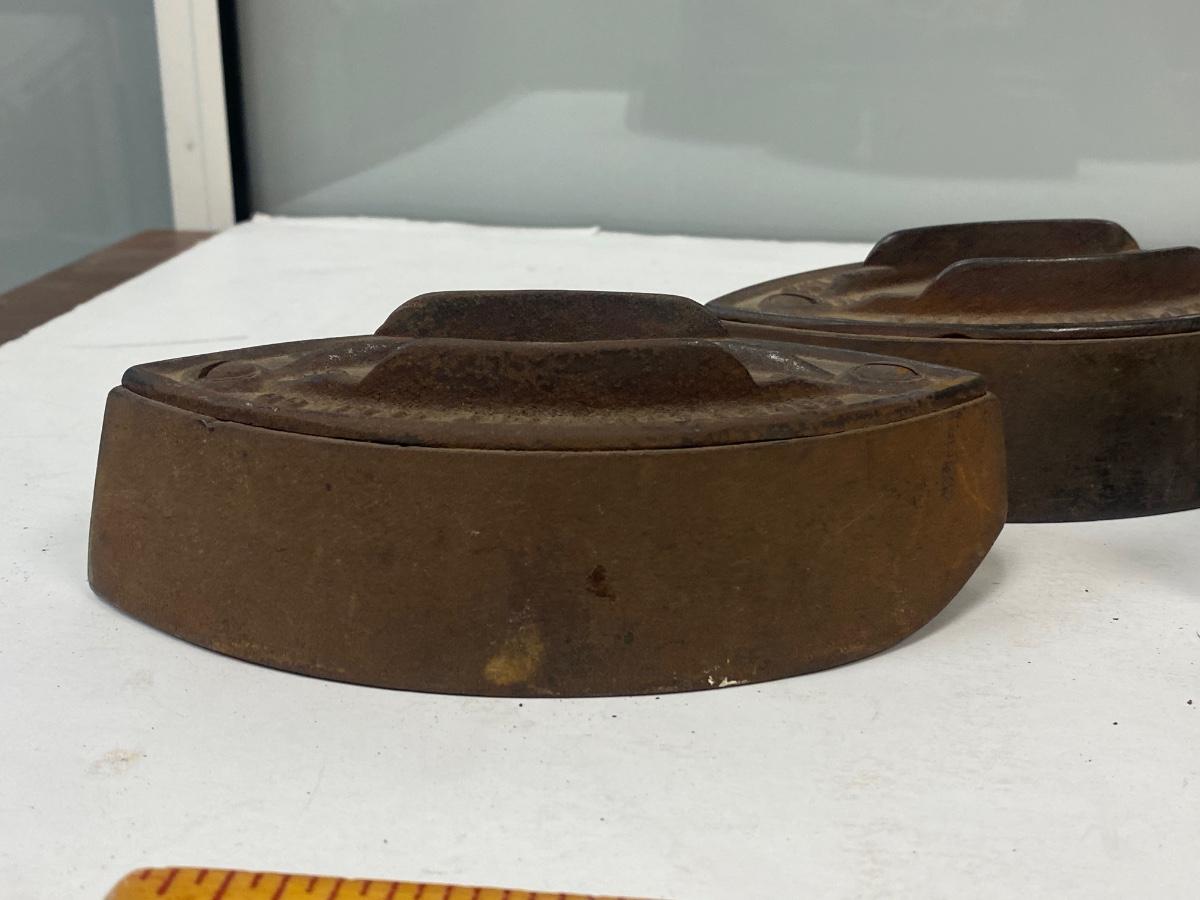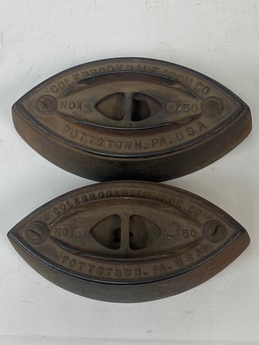 Antique Lot of 3 Cast Metal Sad Irons Colebrookdale Co Pottstown PA. All in good vintage condition. Display great. About the same size.