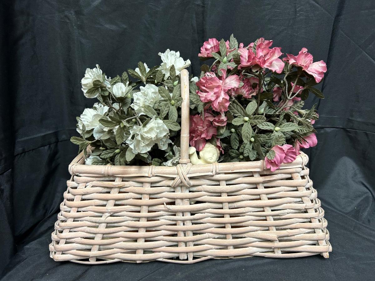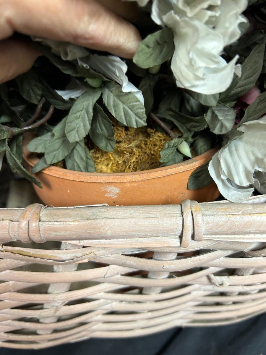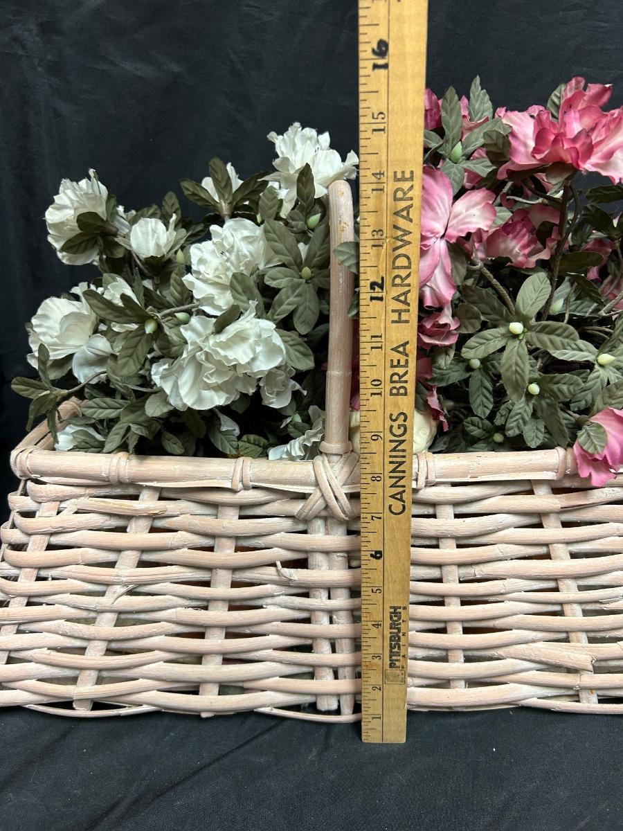 Pale Pink Large Handled Basket with Artificial Faux Flowers in Pots. Flowers are in terra cotta pots, can be removed and basket used for other decor. Basket is about 21" size.