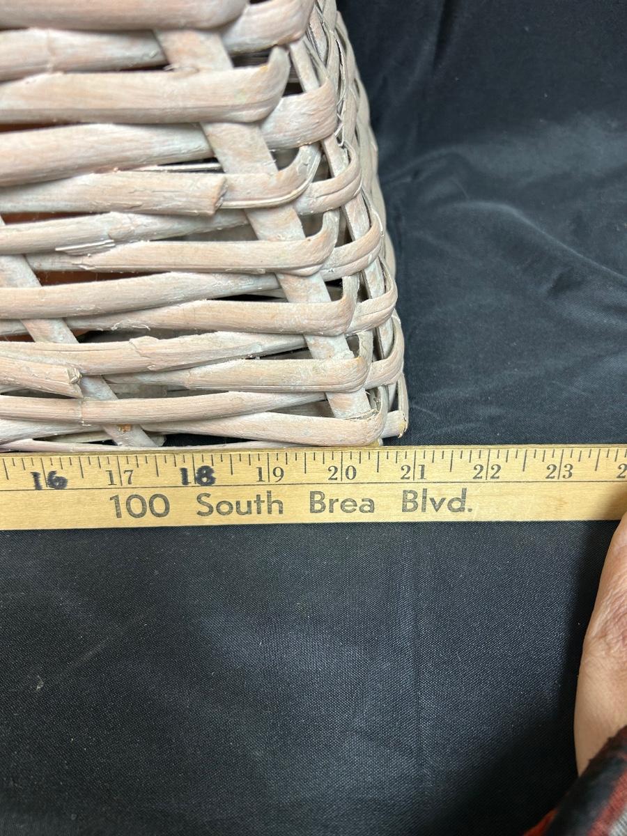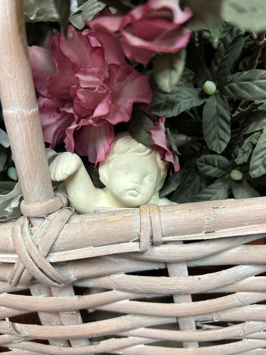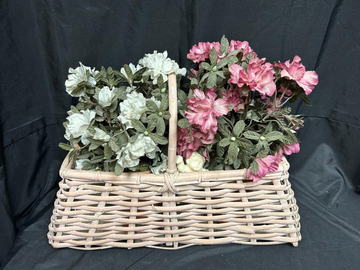 Pale Pink Large Handled Basket with Artificial Faux Flowers in Pots. Flowers are in terra cotta pots, can be removed and basket used for other decor. Basket is about 21" size.