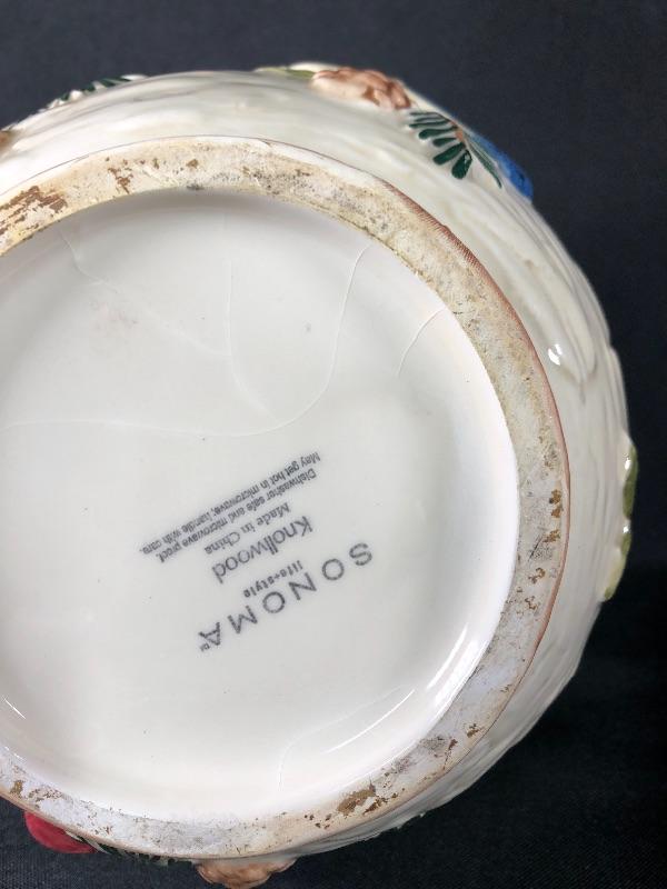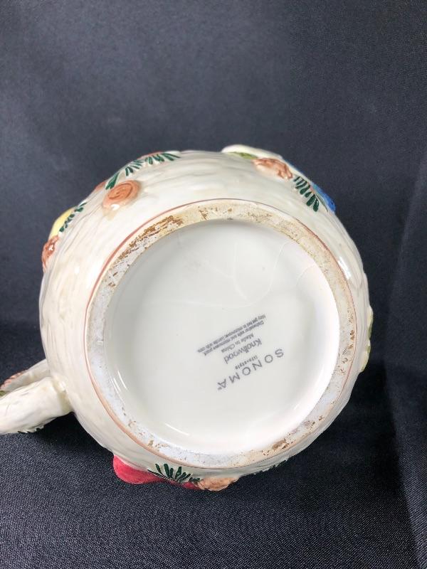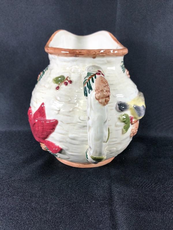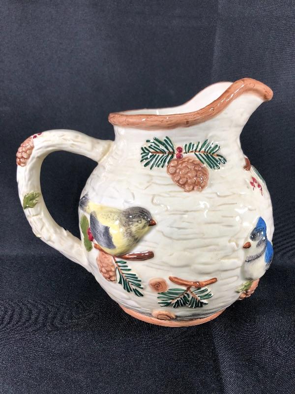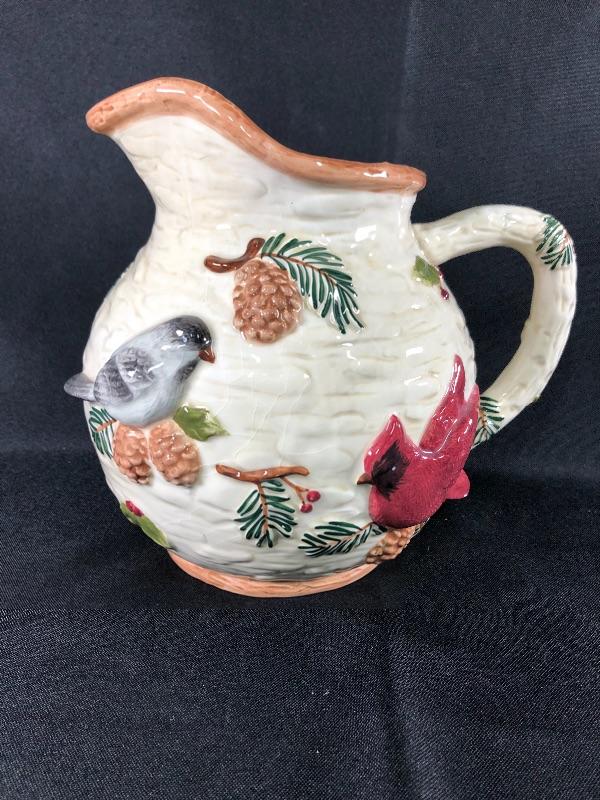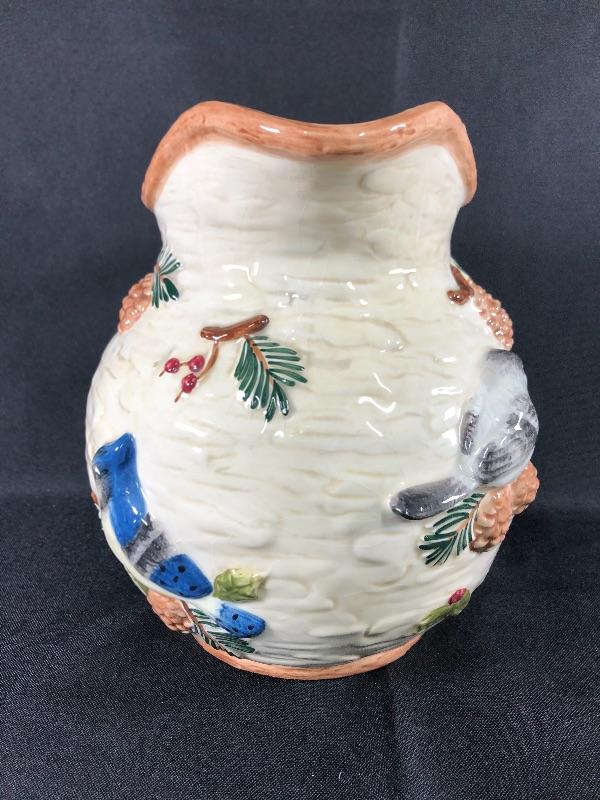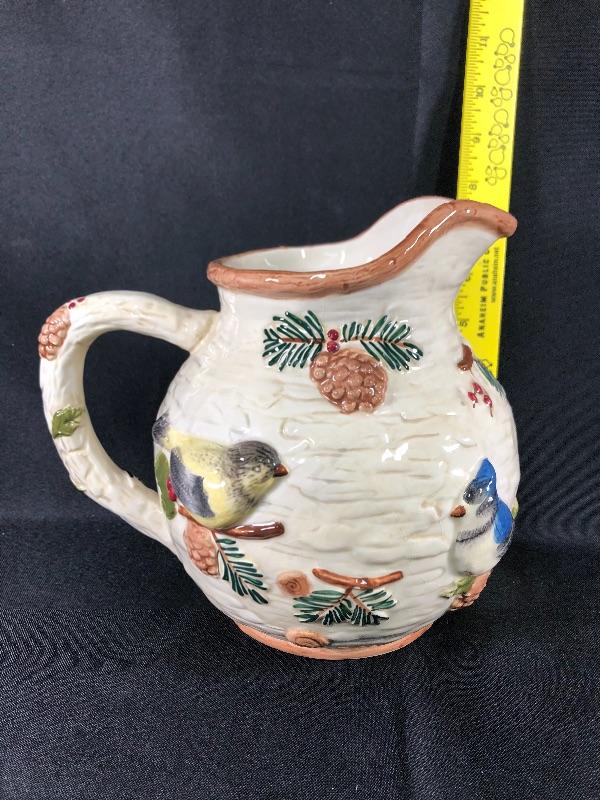 Sonoma brand Knollwood rustic design water pitcher. Features pine cones and birds. About 8" size. Good condition. #020-0415a13