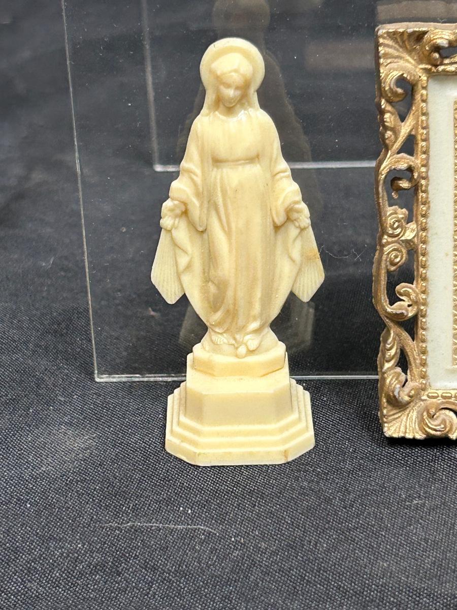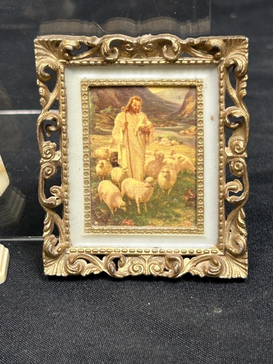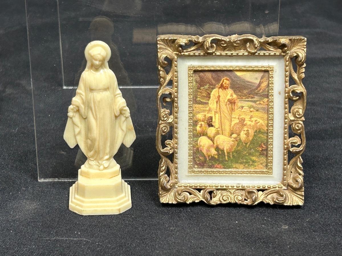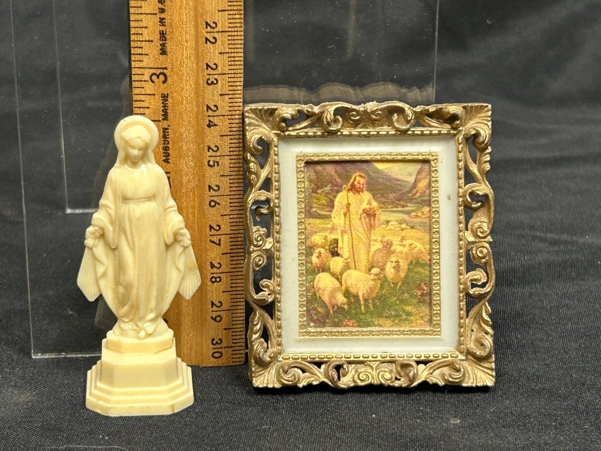 Pair of Miniature Small Religious Spiritual Figurines Frame Jesus with Flock of Sheep and Plastic Virgin Mary