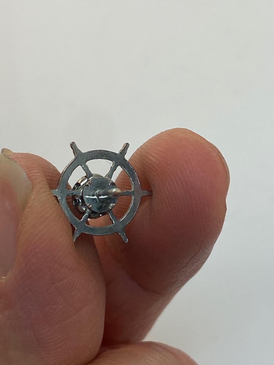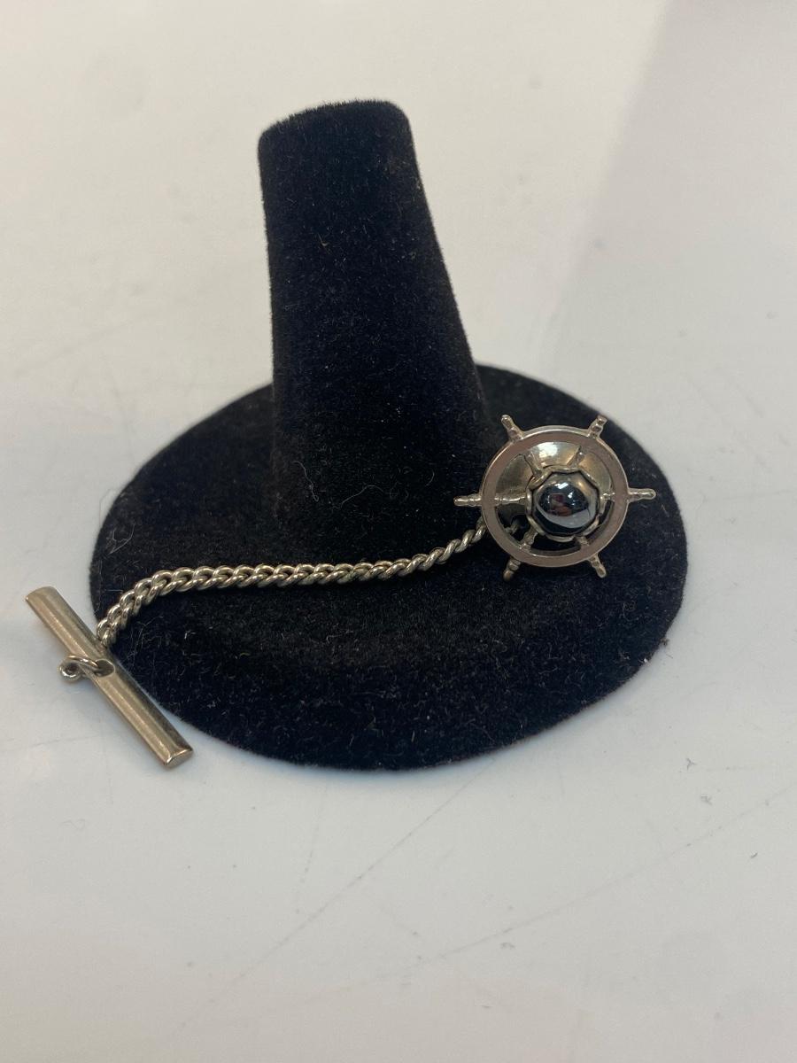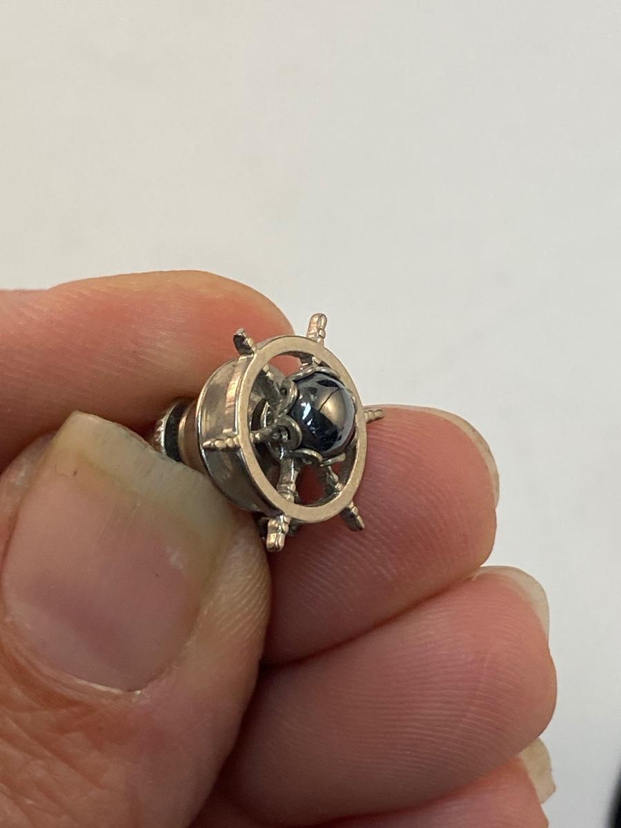 Vintage Silver Tone Ship Captains Wheel with Faux Black Pearl Center Lapel Pin Tie Tack. About 1/2" size. Unbranded.