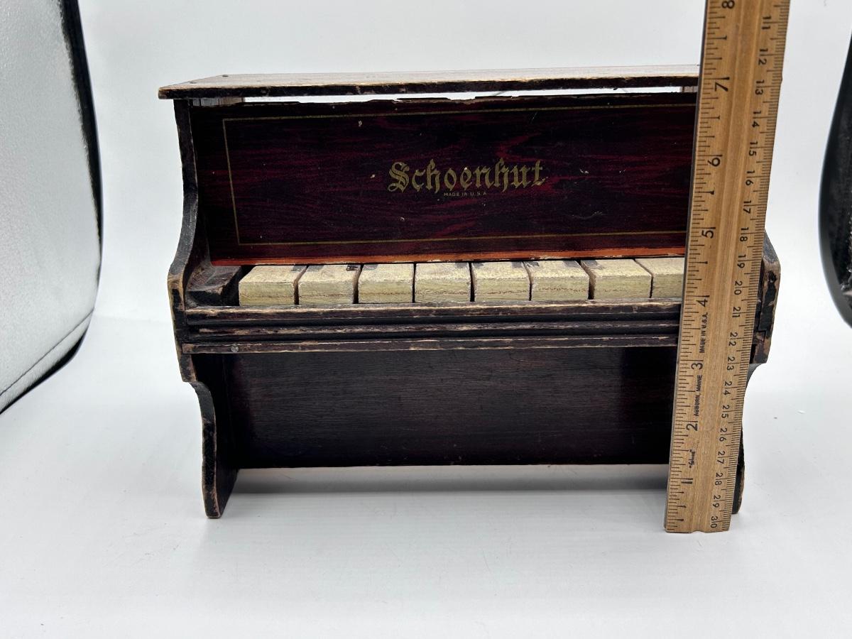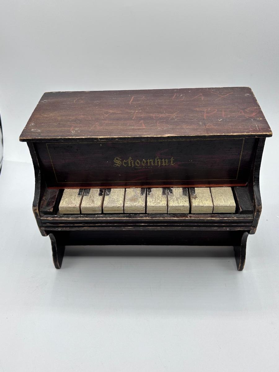 Vintage Worn Schoenhut Childs Piano Upright Works. Has signs of age and play. Some has written on it with crayon. Displays nice. All keys make noise when pushed.