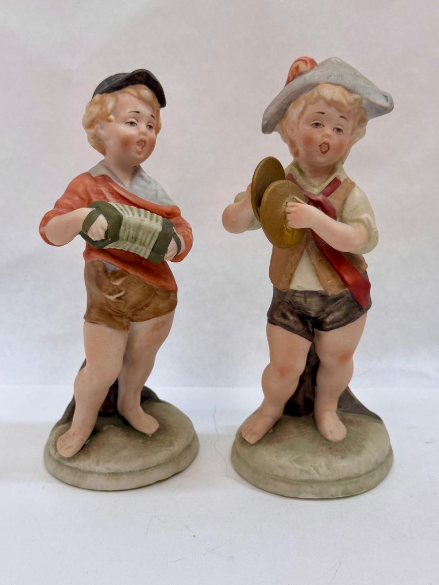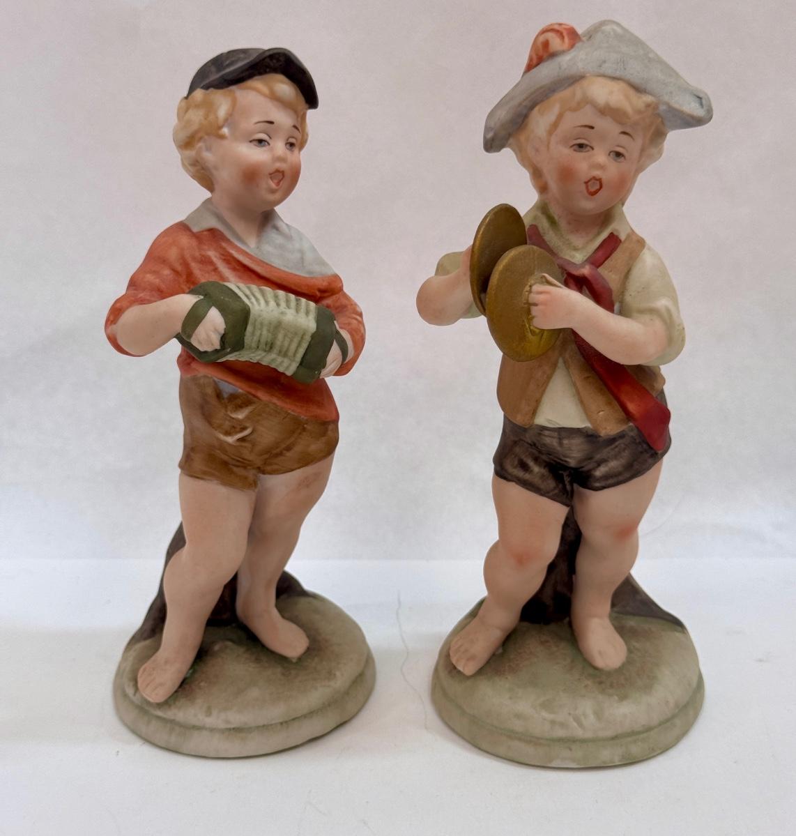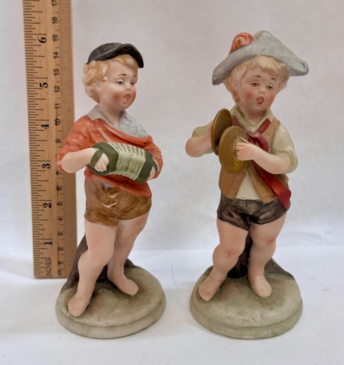 Antique Hand-painted Bisque Porcelain Boys with Musical Instruments Figurines