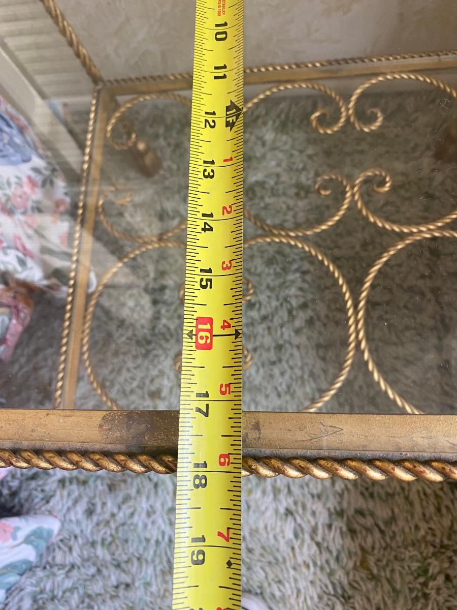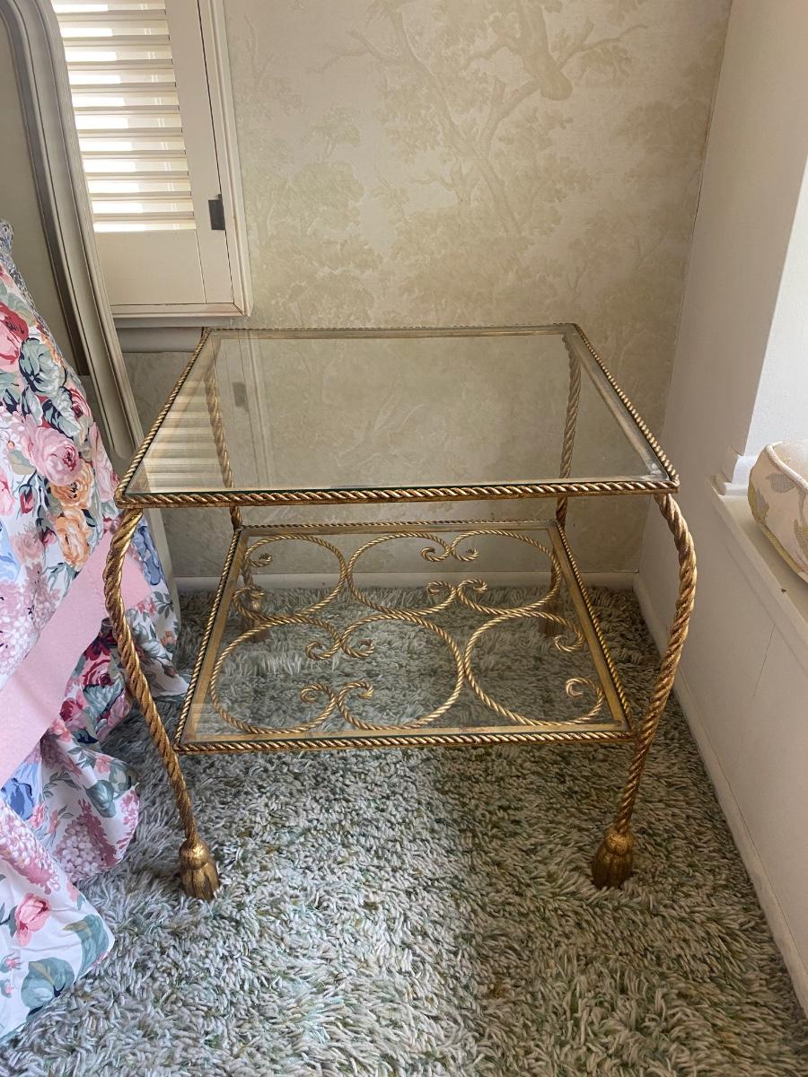 Vintage Midcentury Hollywood Regency Gold Tone Brass Metal and Glass Double Surface End Side Table. Twisted metal frame with tassel like feet. Glass top and lower surface.