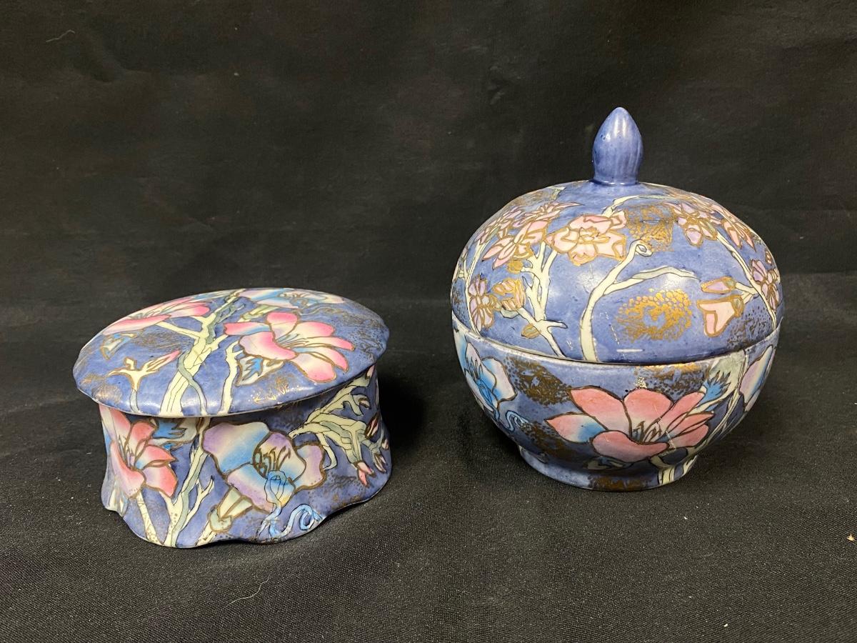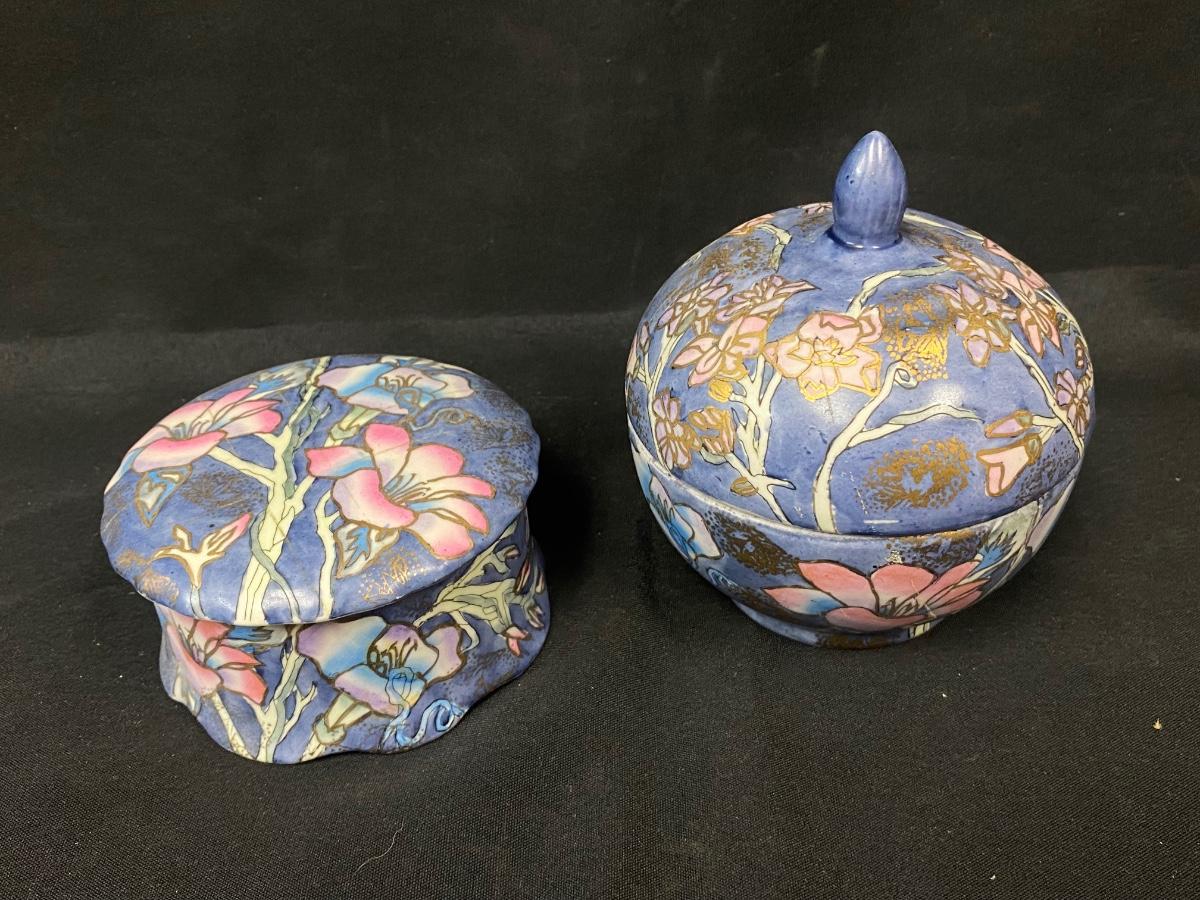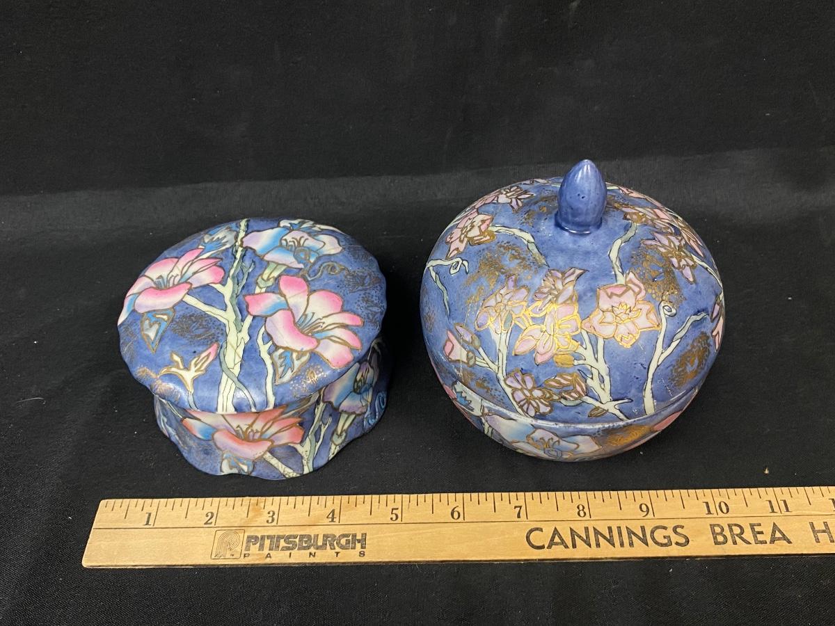 Pair of Vintage Gold Gilt Accent Floral Porcelain Lidded Trinket Jewelry Powder Boxes Dishes