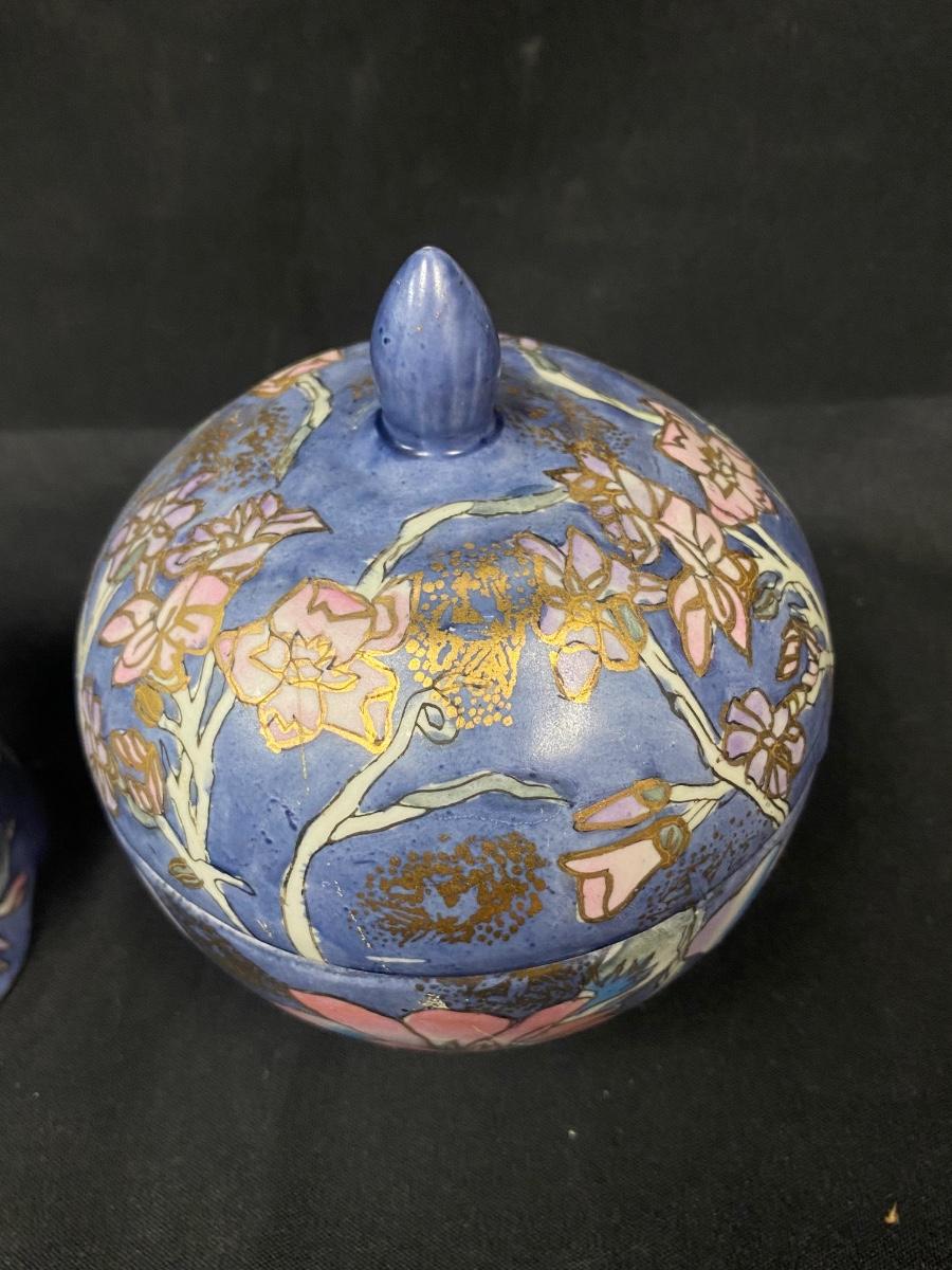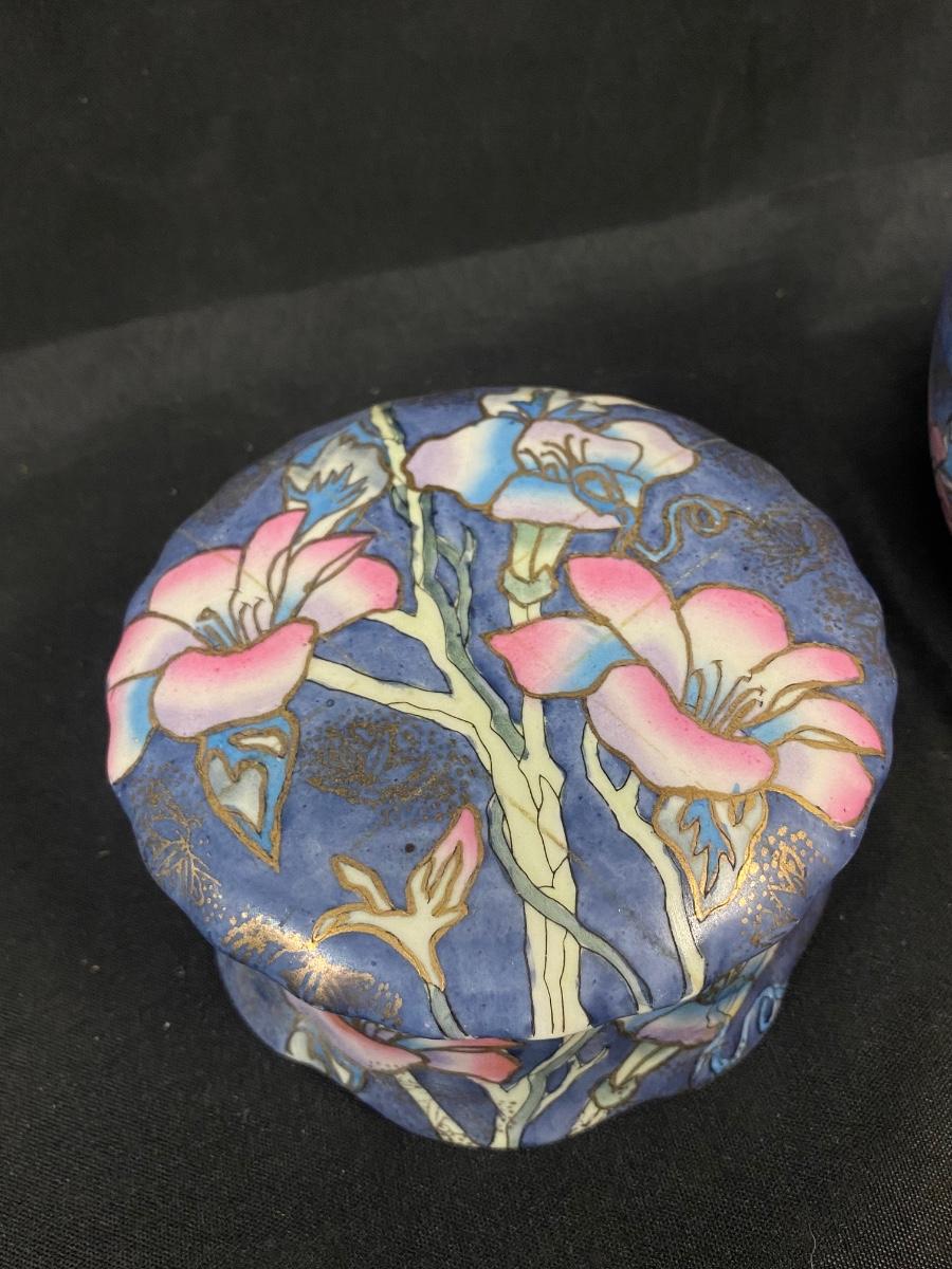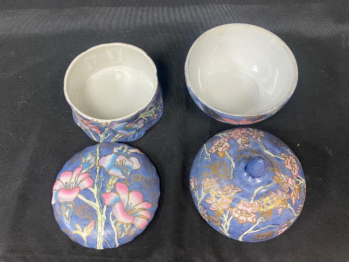 Pair of Vintage Gold Gilt Accent Floral Porcelain Lidded Trinket Jewelry Powder Boxes Dishes