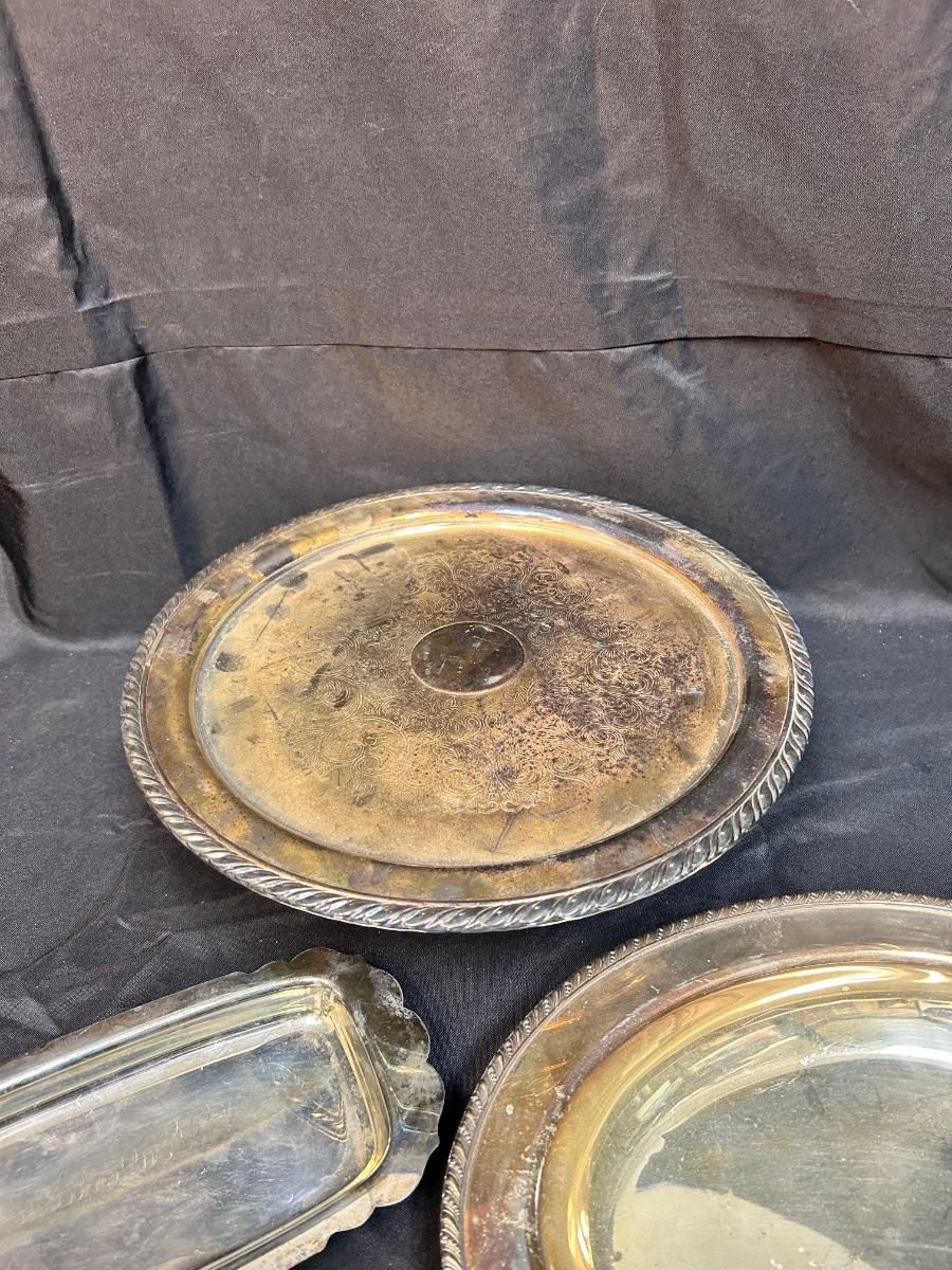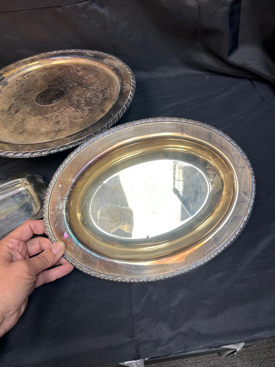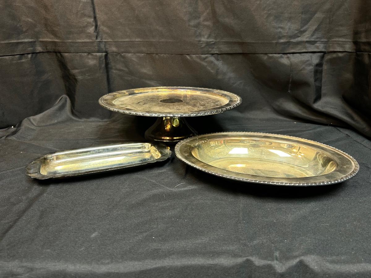 Three Piece Lot of Vintage Silver Plate Serving Pieces Pedestal Plate Shallow Bowl Butter Dish