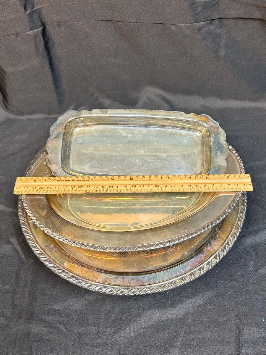 Three Piece Lot of Vintage Silver Plate Serving Pieces Pedestal Plate Shallow Bowl Butter Dish. Need to be polished but in otherwise good condition.