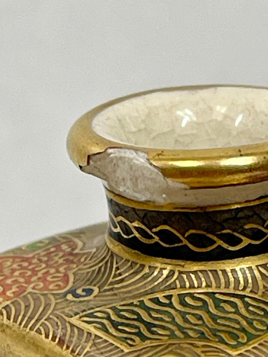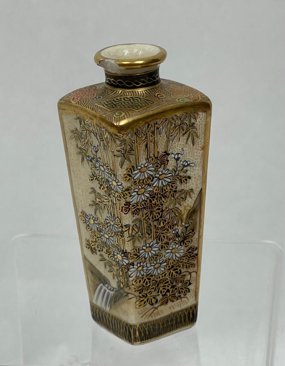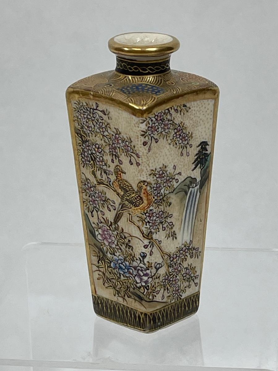 Miniature Vase Satsuma Style cream colored glaze bird & flower scenes with gilt 3.5"