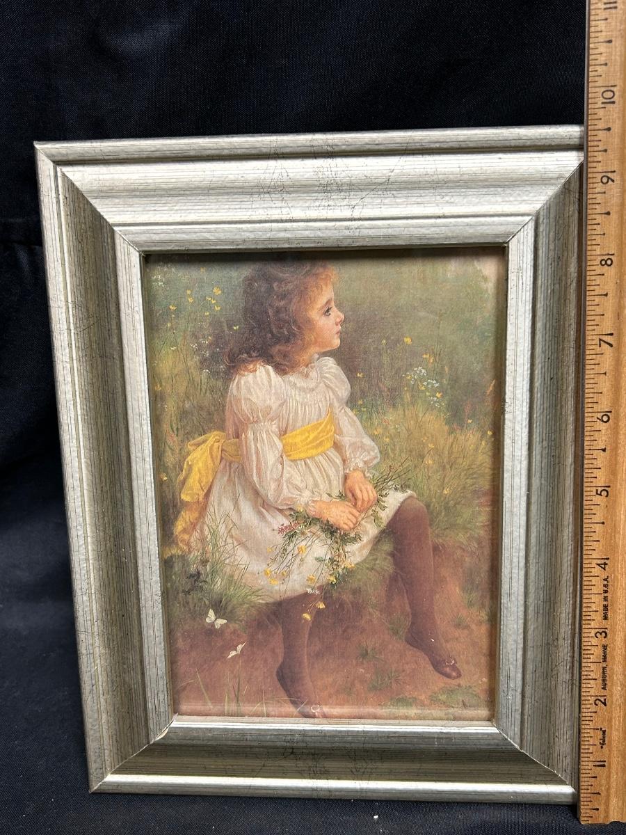 Framed Art Print Victorian Girl Sitting on Grassy Ledge. In good condition. Frame holds 5x7 photos.