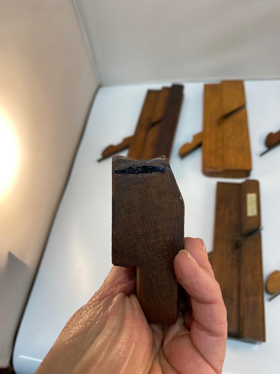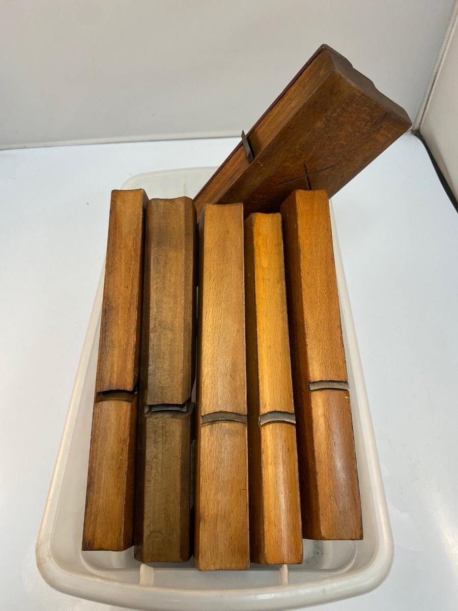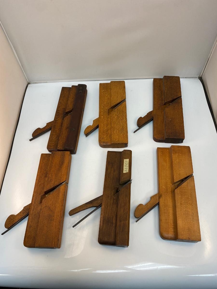 Set of Six Vintage Antique Wood Moulding Planes Curved Rounding Blades. Larger rounding edge planes. All have blades. In good antique condition. May have previous owner names or initials stamped in the end .