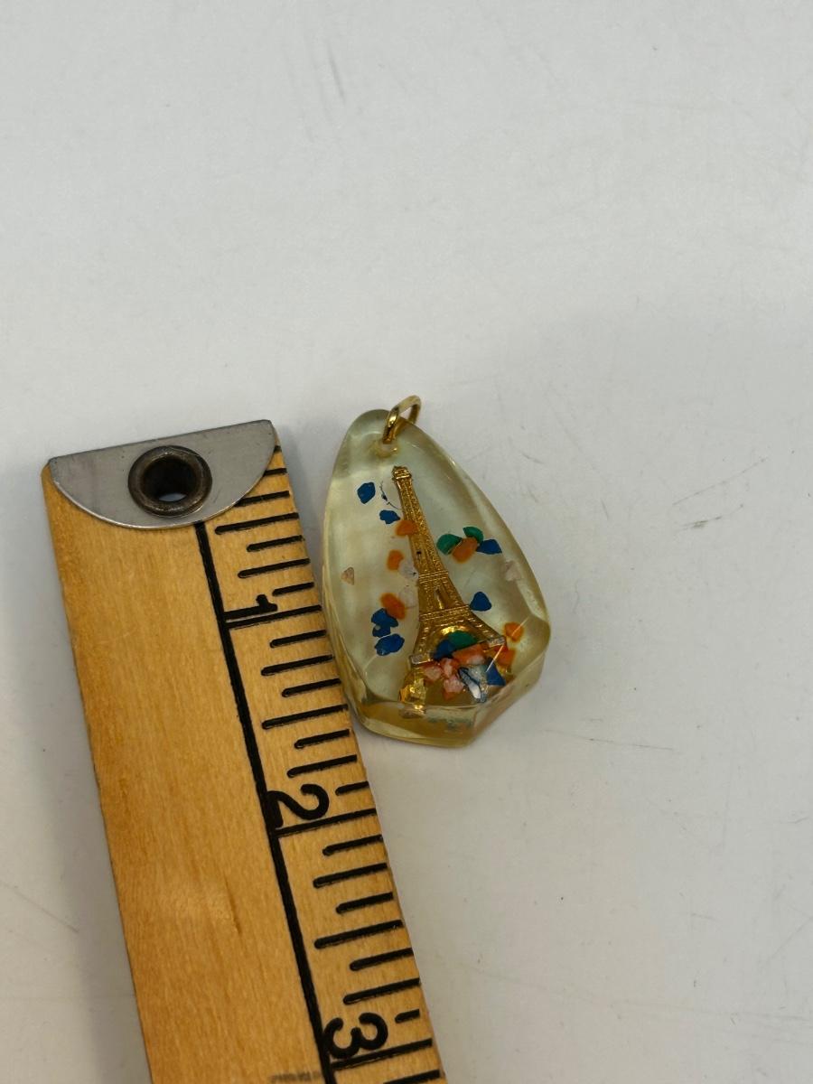 Vacation Souvenir Collectible Eiffel Tower in Speckled Lucite Resin Pendant Charm. In good condition. May have been part of a keychain based on size.