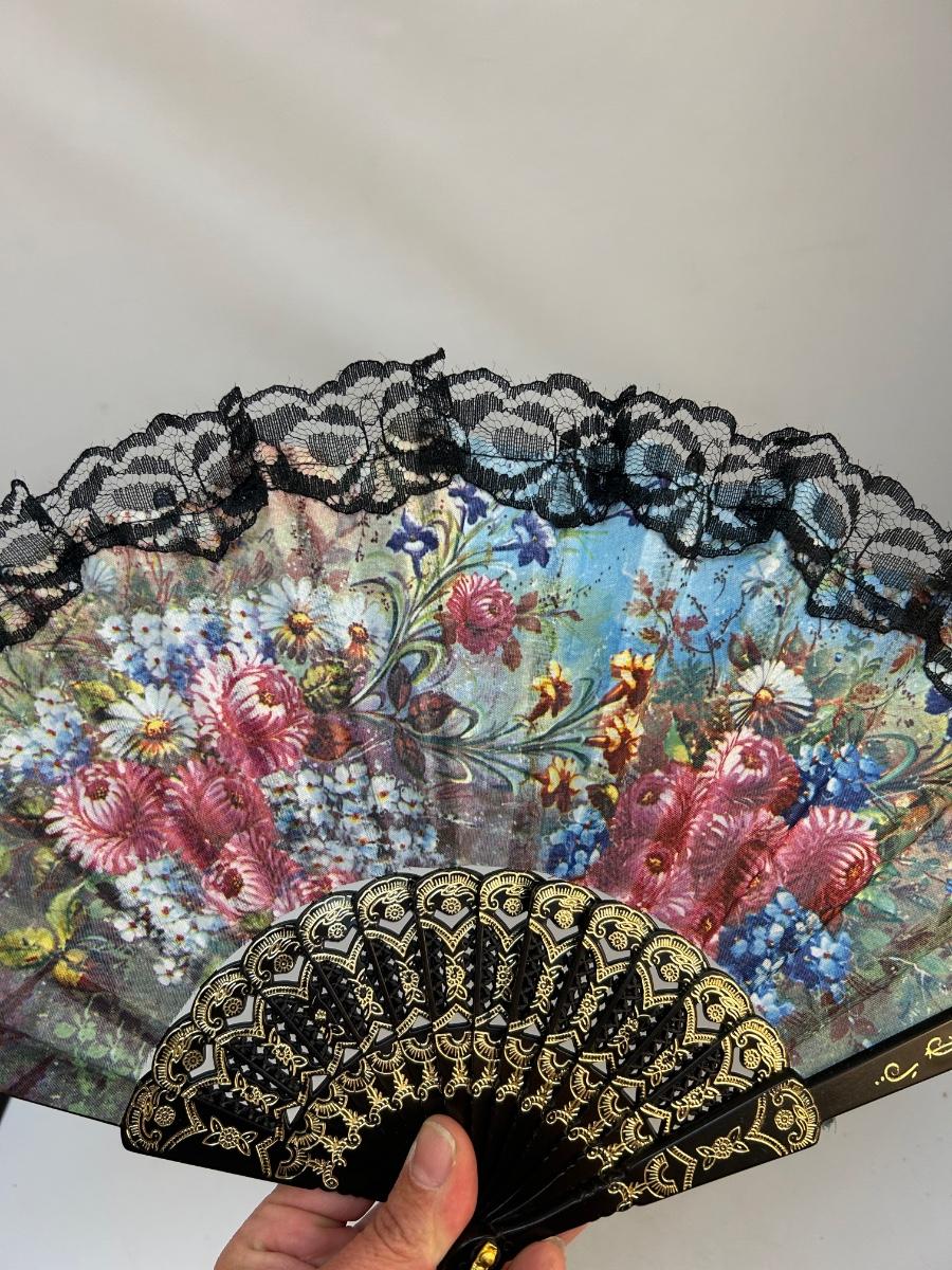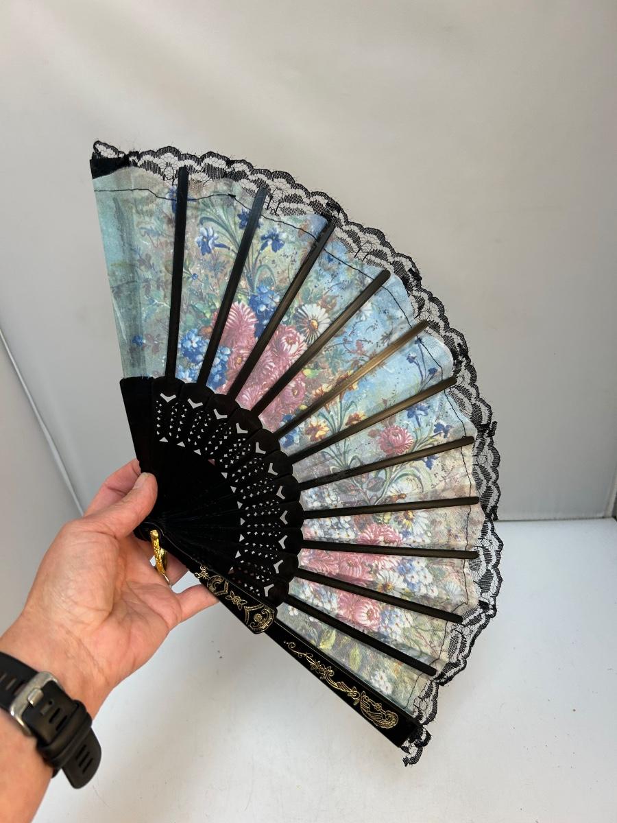 Vintage Black Lace Floral Pattern Plastic Hand Fan. In good condition.