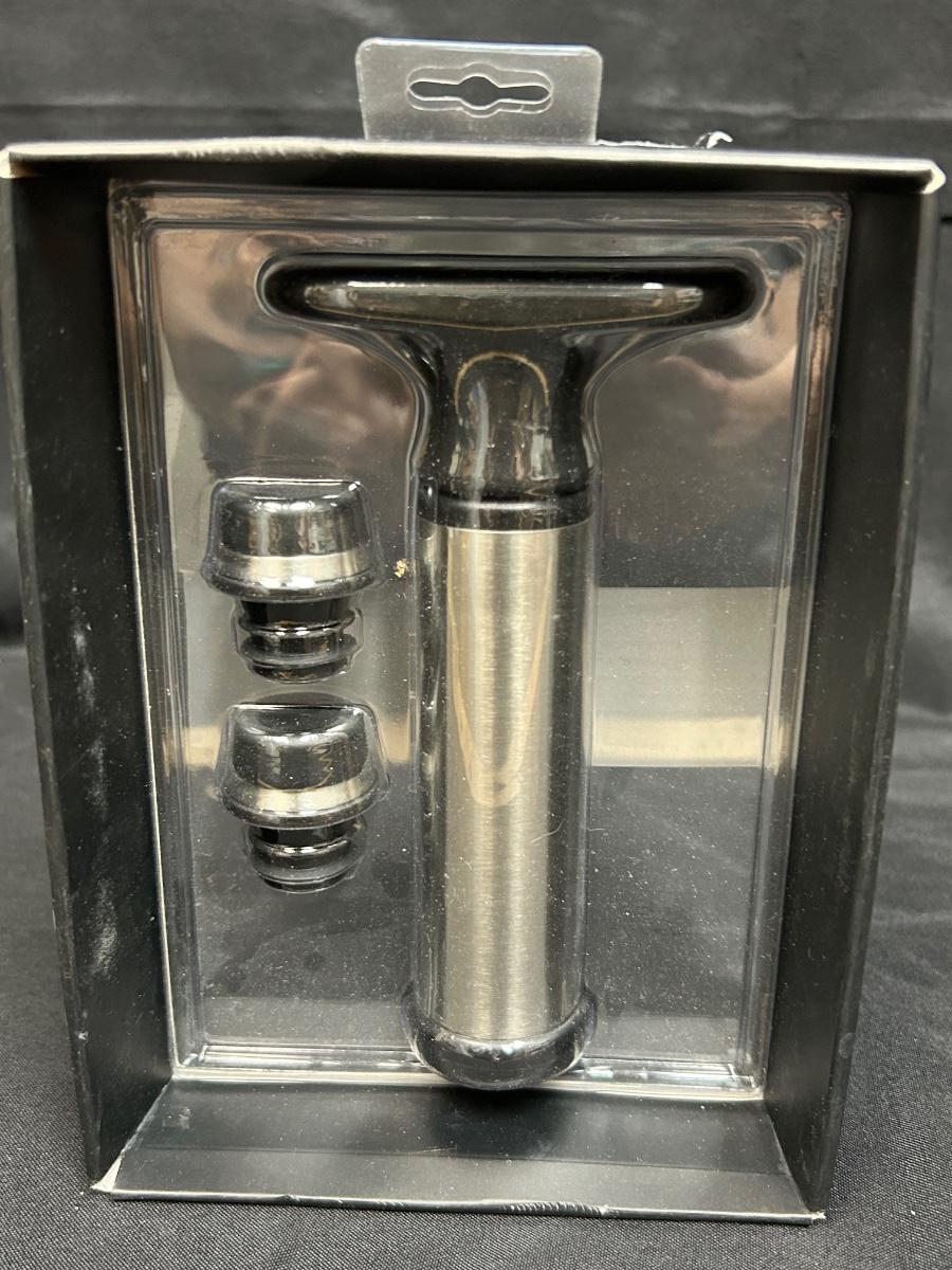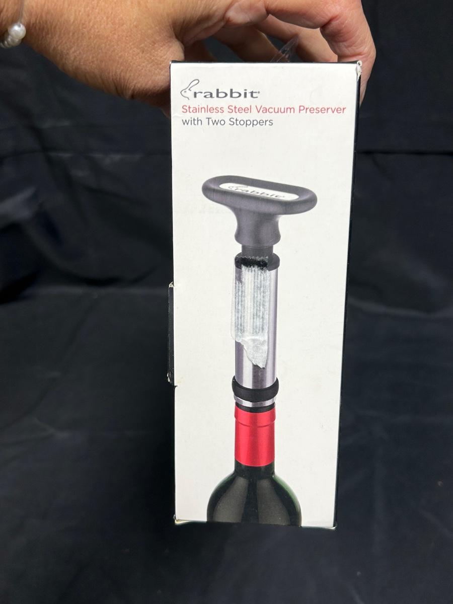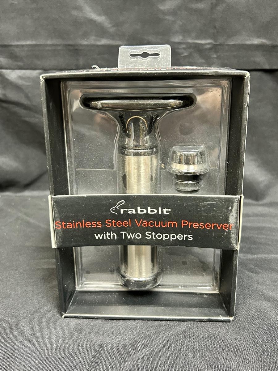 New in Package Rabbit Stainless Steel Vacuum Preserver with Two Stoppers Wine Bottle Storage Barware Gadget. New, unopened.