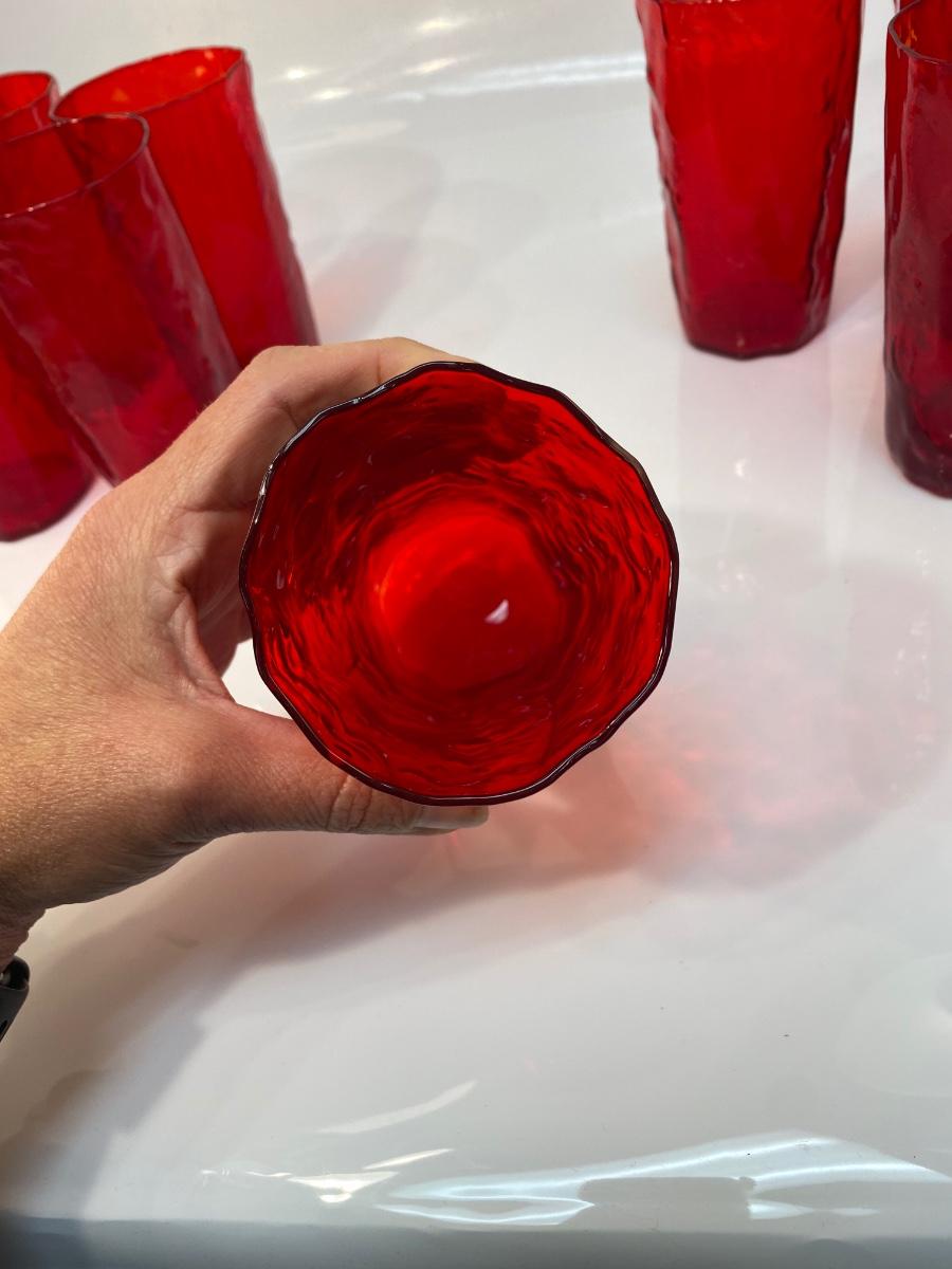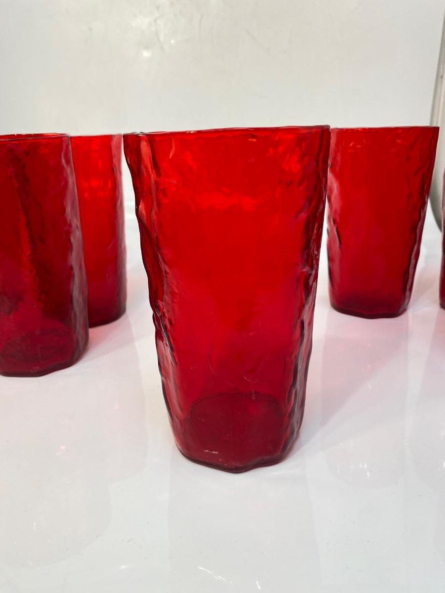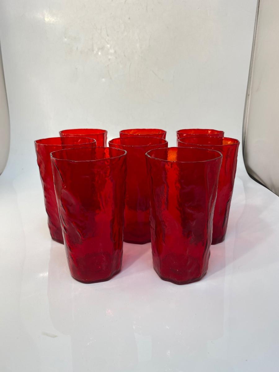 Set of 8 Vintage Ruby Red Amberina Morgantown Crinkle Glass Drink Glasses. In good vintage condition. No chipped edges. Vibrant red color. 5.5" size.