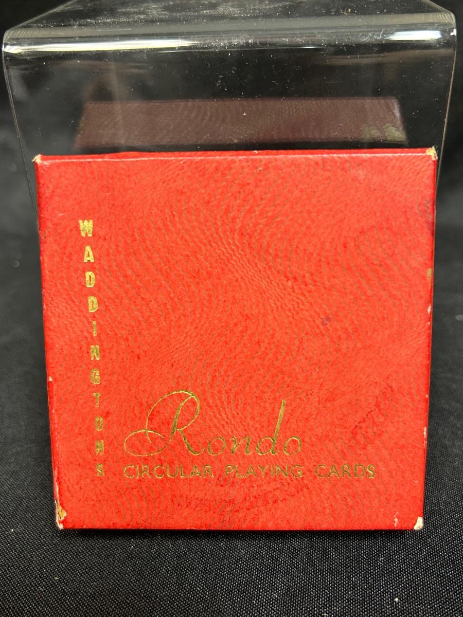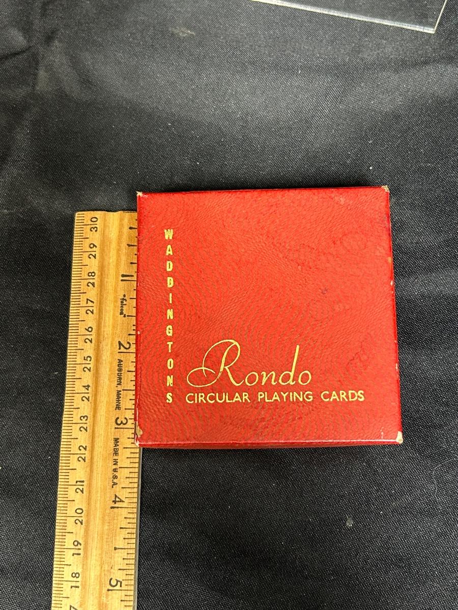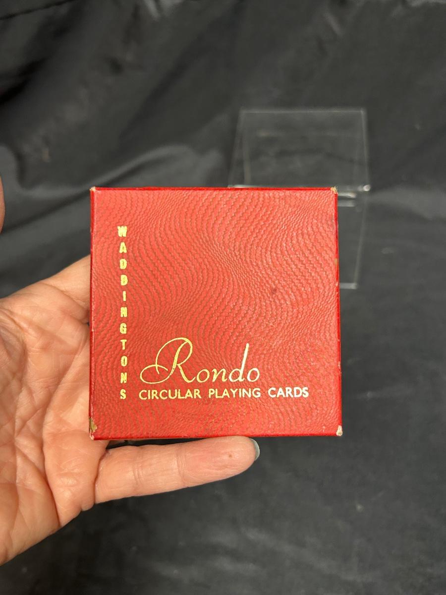 Vintage Waddingtons Rondo Circular Playing Cards Gears Cog Wheels Steampunk Design. In good condition. Deck is complete. Cards are in very good condition, box has light wear.