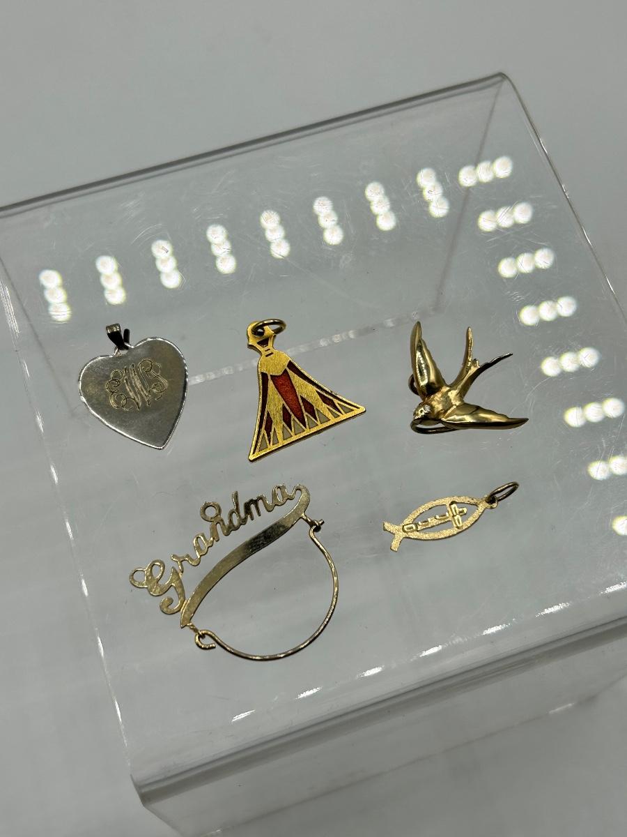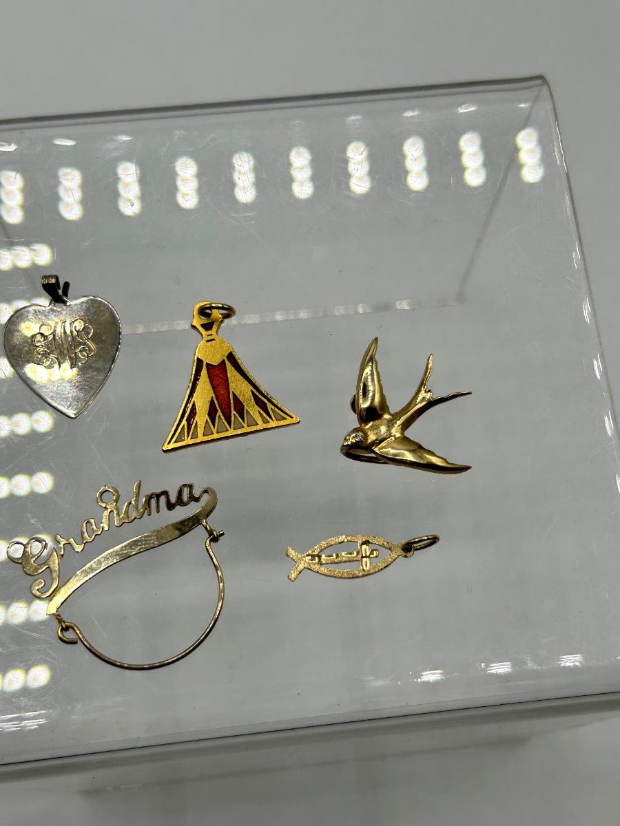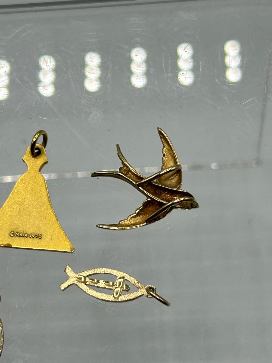 Mixed Lot of Gold Tone Pendant Necklace Charms Grandma Jesus Fish Swallow. No gold marks found. In good vintage condition.