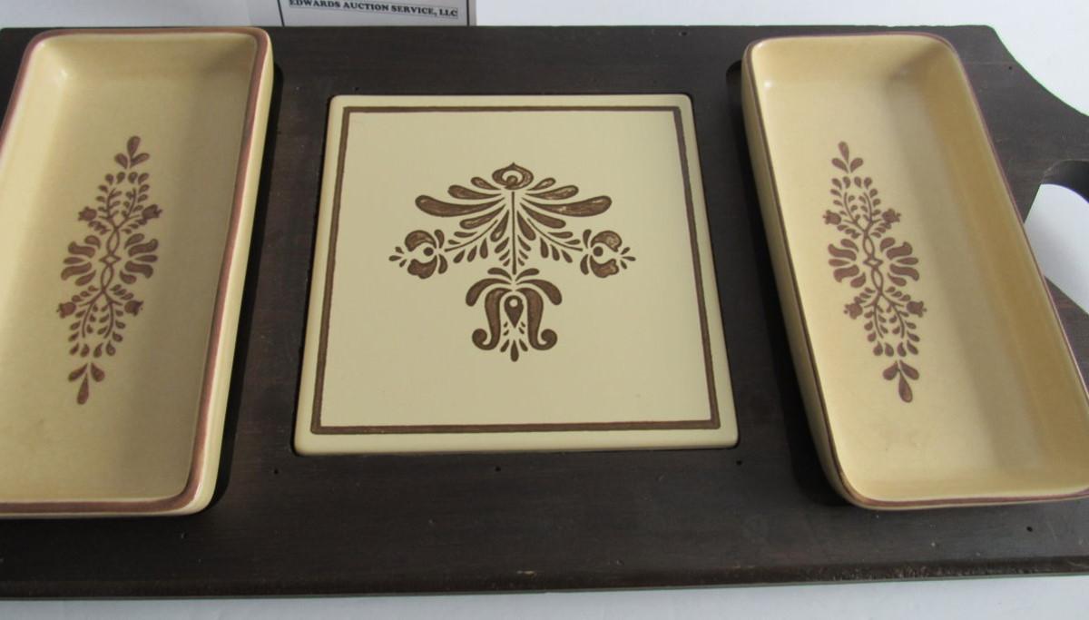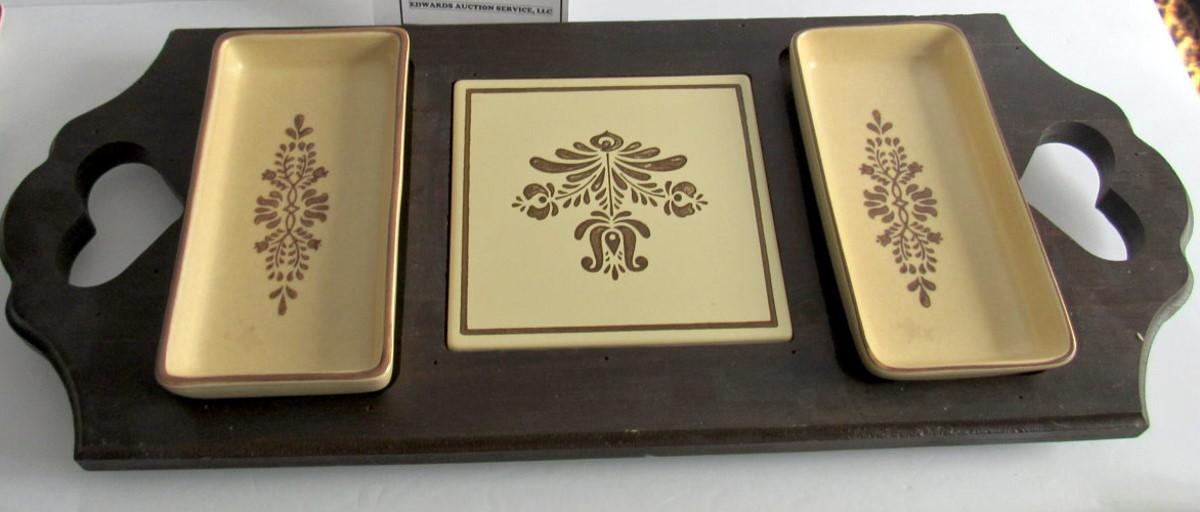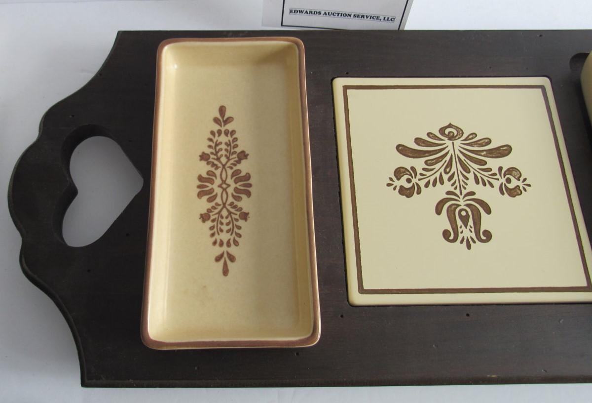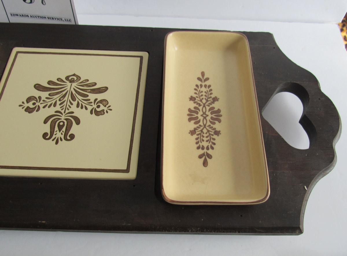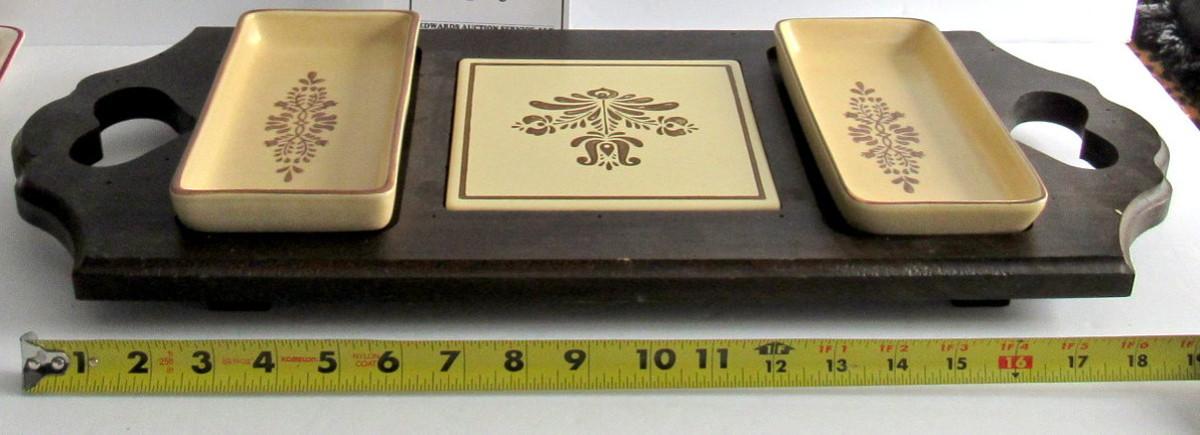 Vintage Pfaltzgraff Village Pattern Cheese and Cracker Tray, Wood Base, Signed
