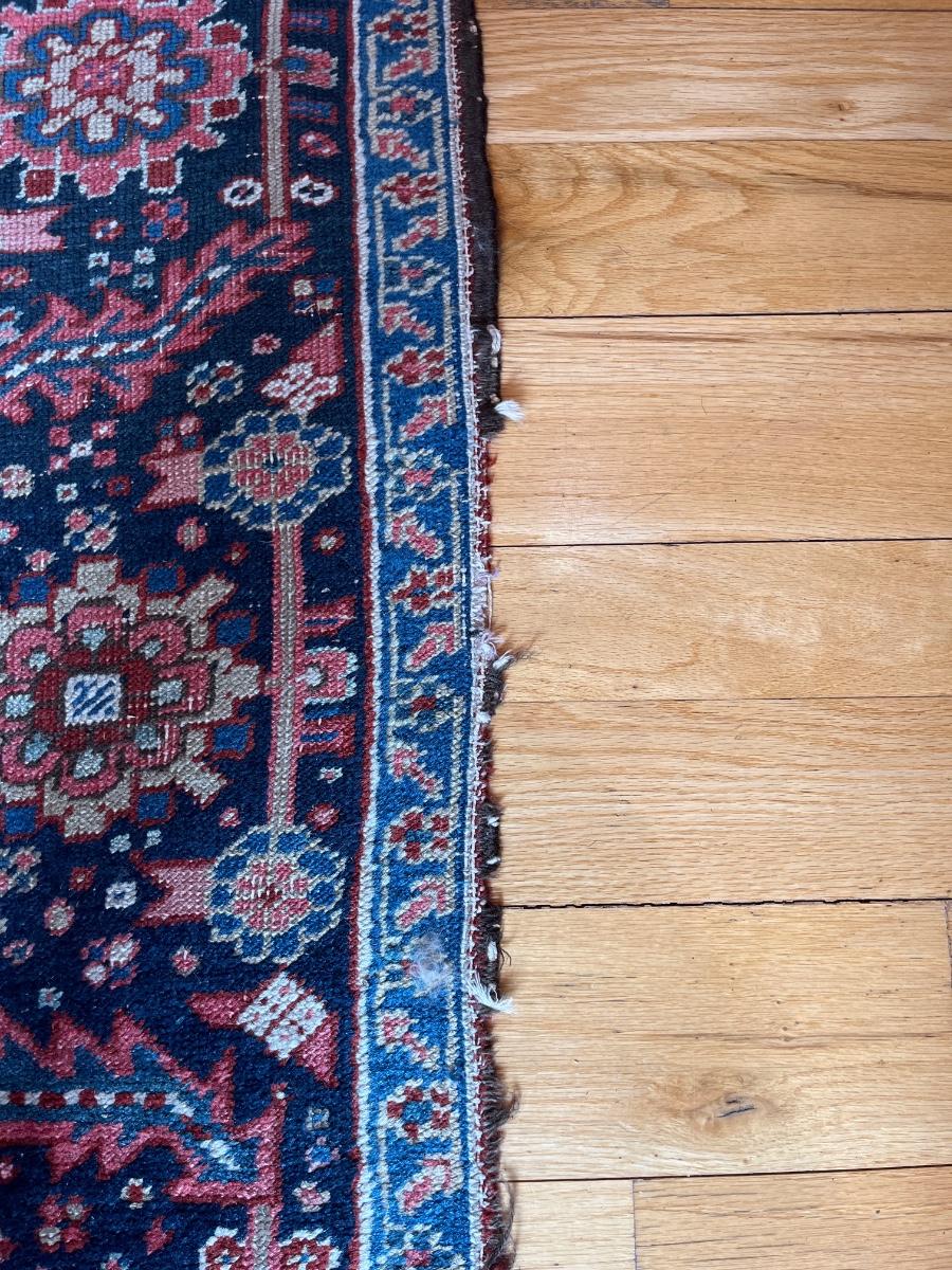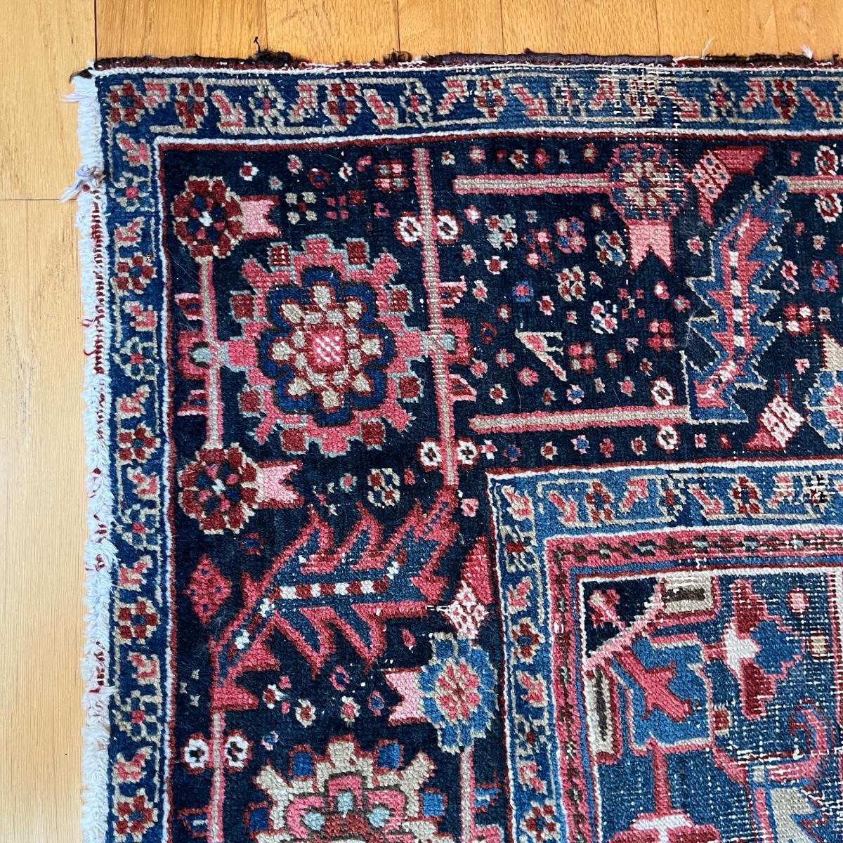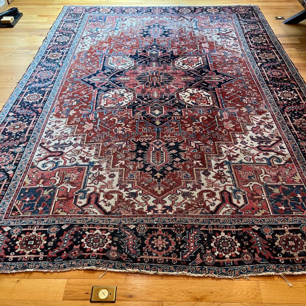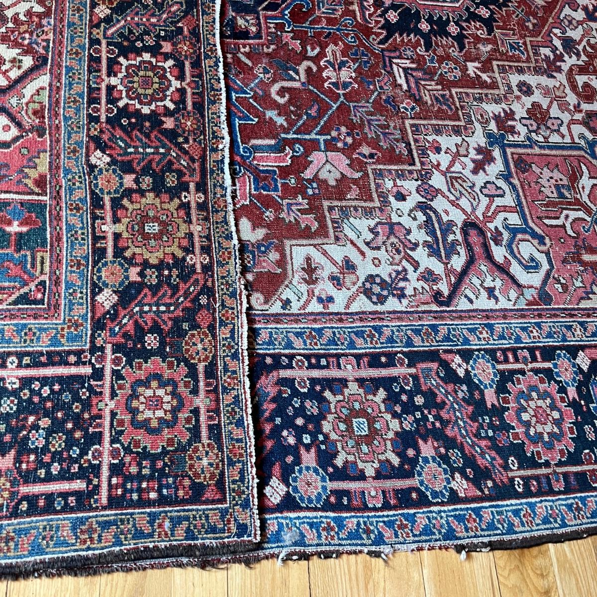 This large area rug measures 11’ 8” x 8’ 4” and is predominantly red and dark blue with light blue and cream color also. Rug has some fraying on ends, see pictures. Also includes non slip mat.