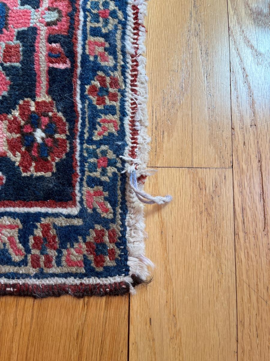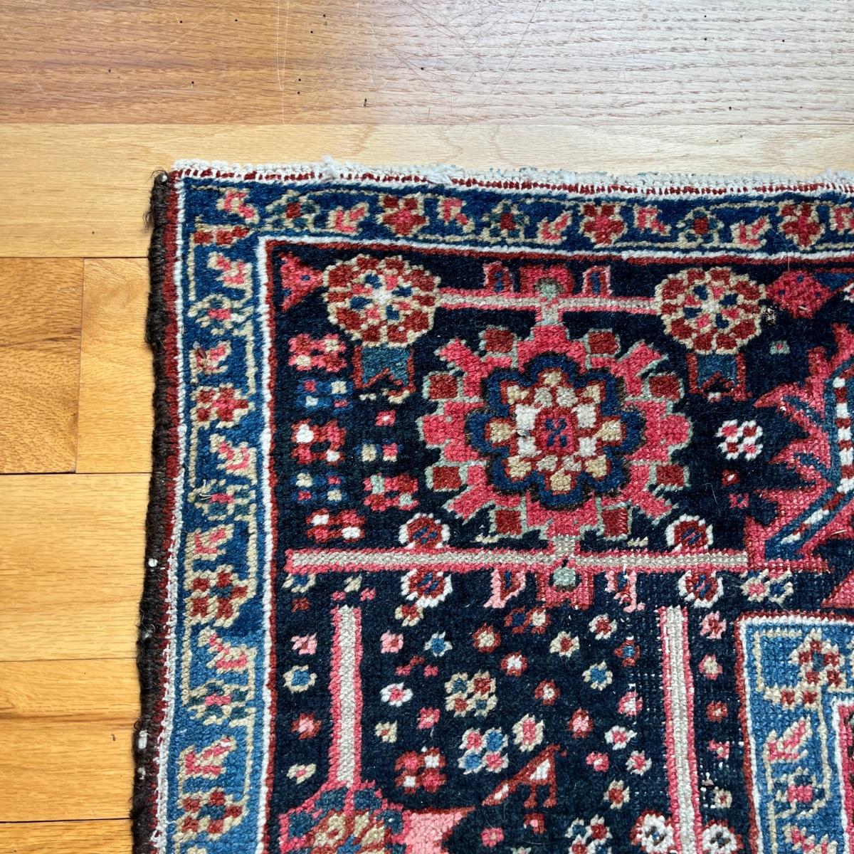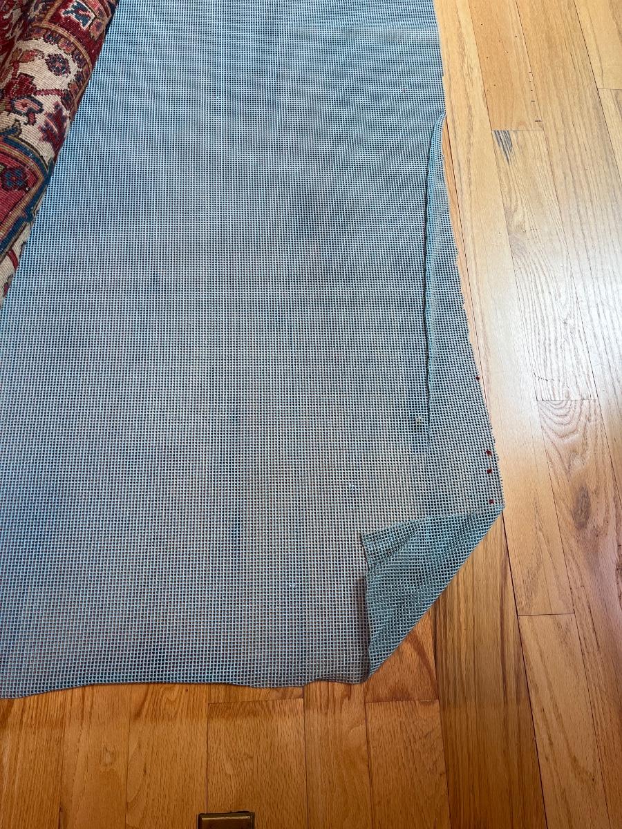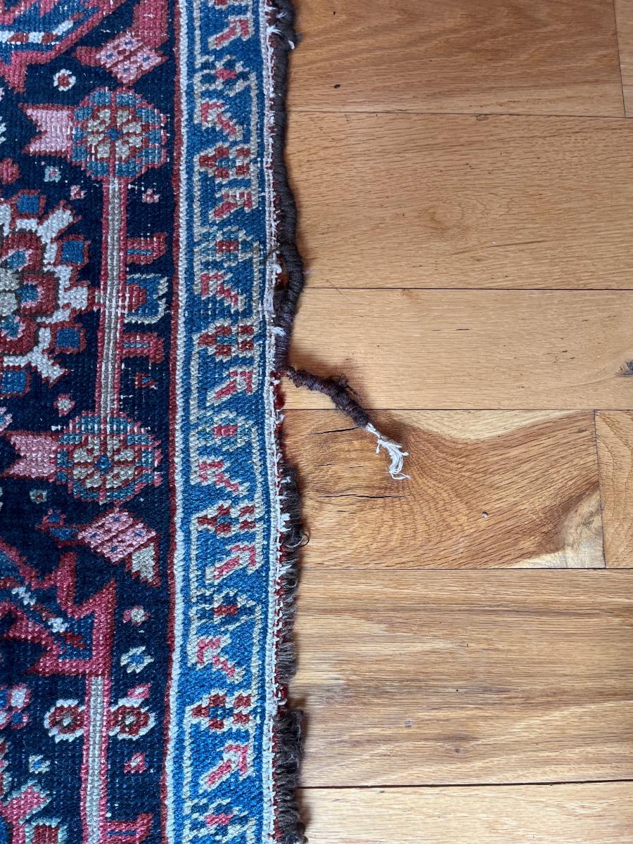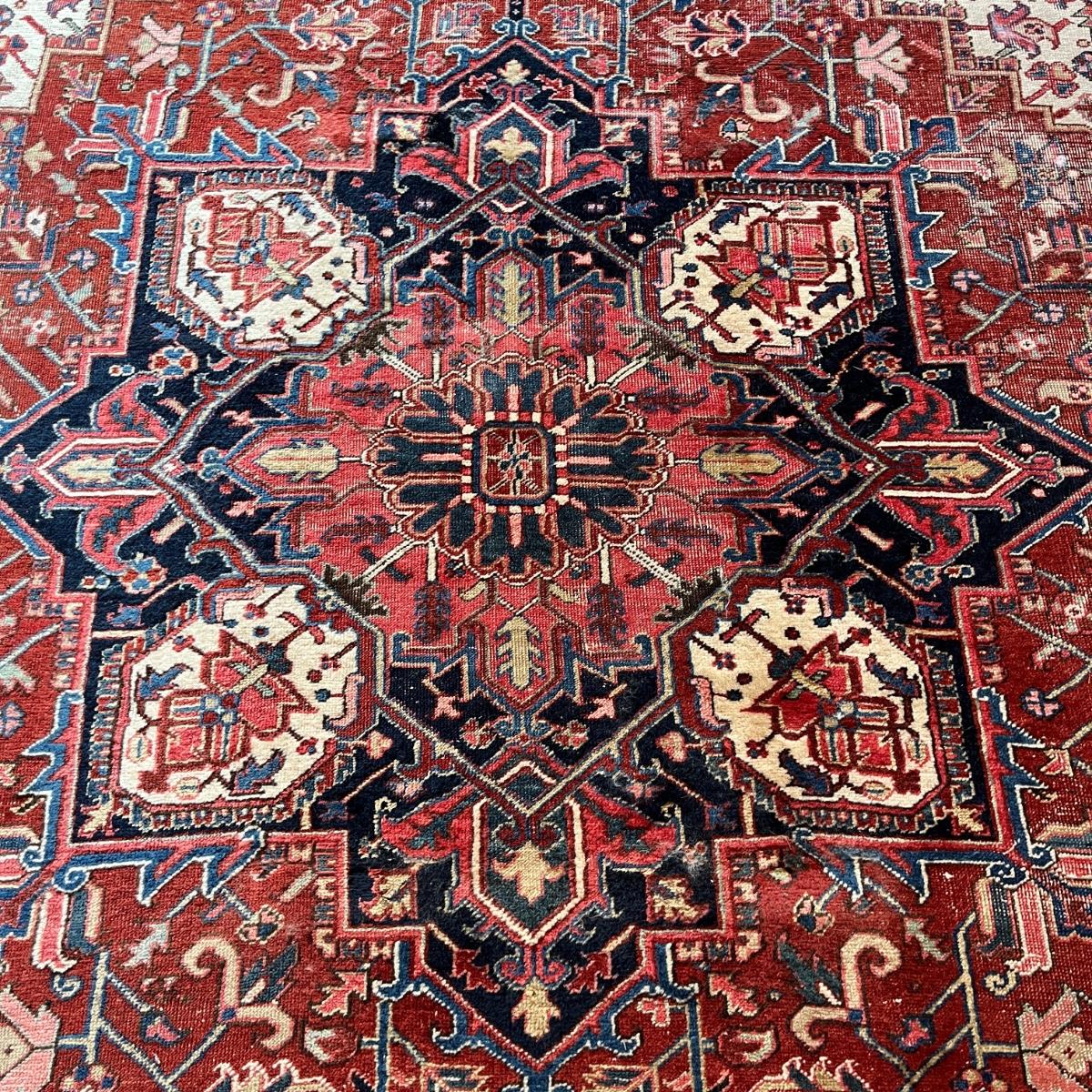 This large area rug measures 11’ 8” x 8’ 4” and is predominantly red and dark blue with light blue and cream color also. Rug has some fraying on ends, see pictures. Also includes non slip mat.