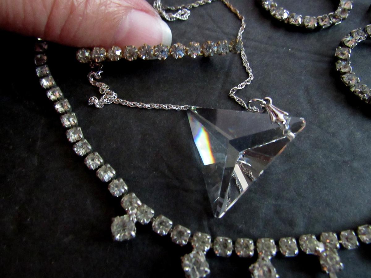 Necklace, nice shape, unmarked. The big stone looks almost yellowish in person. Nice pair round earrings, marked Coro, nice shape. Unmarked bar pin, some bending of the pin nice otherwise. And a Triangular shaped clear plastic pendant/necklace on a Sterling chain. Chain needs cleaning. Shipping is available at actual shipping cost plus $5.00 handling fee per box for supplies/labor. See our terms for details. All sales are final. Condition notes may not be all inclusive, we may miss some issues as most vintage items are not in mint condition and have some degree of wear, paint loss, etc, but we always try to note obvious damage.