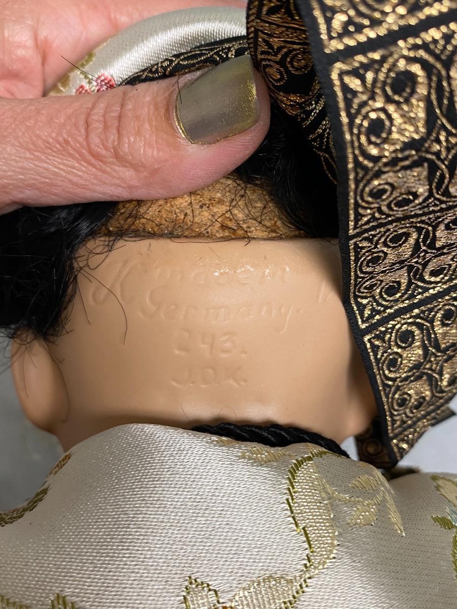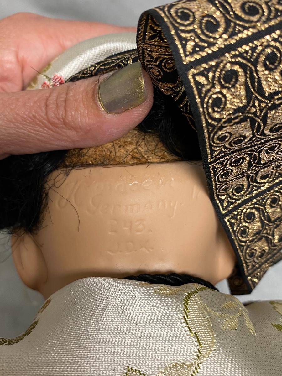 Ornate Costume Ethnic Asian Bisque & Composite Doll. Head is marked JDK 243. Costume is nicely done. About 14" size.