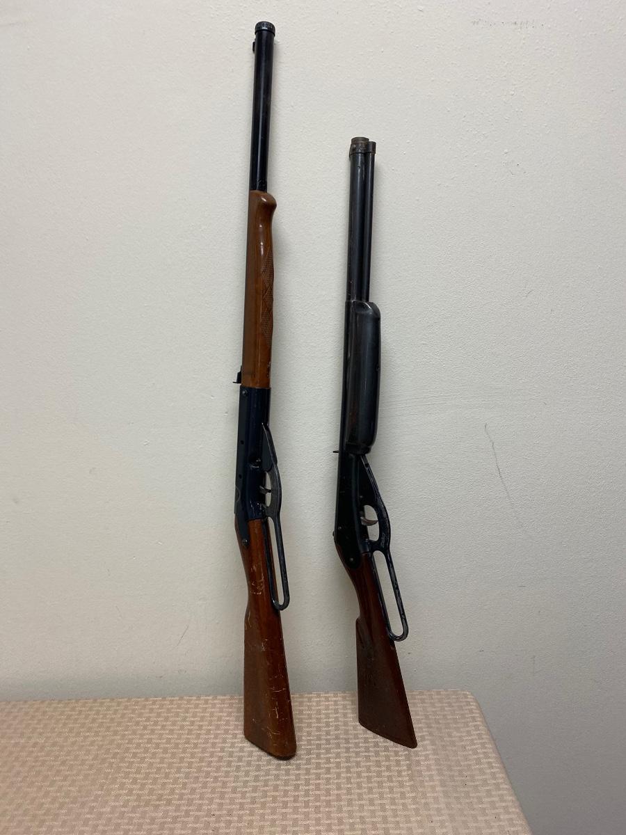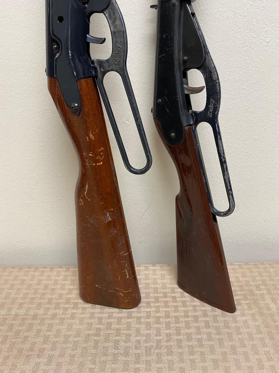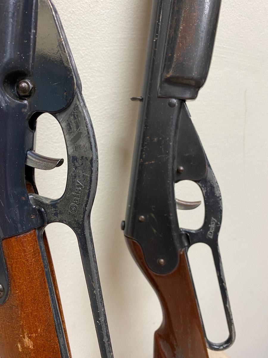 Vintage Daisy BB Pellet Gun Lever Action Air Rifles. The shorter one seems to be older, has more power it seems when shot. Both seem to be working fine, did not have actual ammo to fire but lever action works nicely on both.