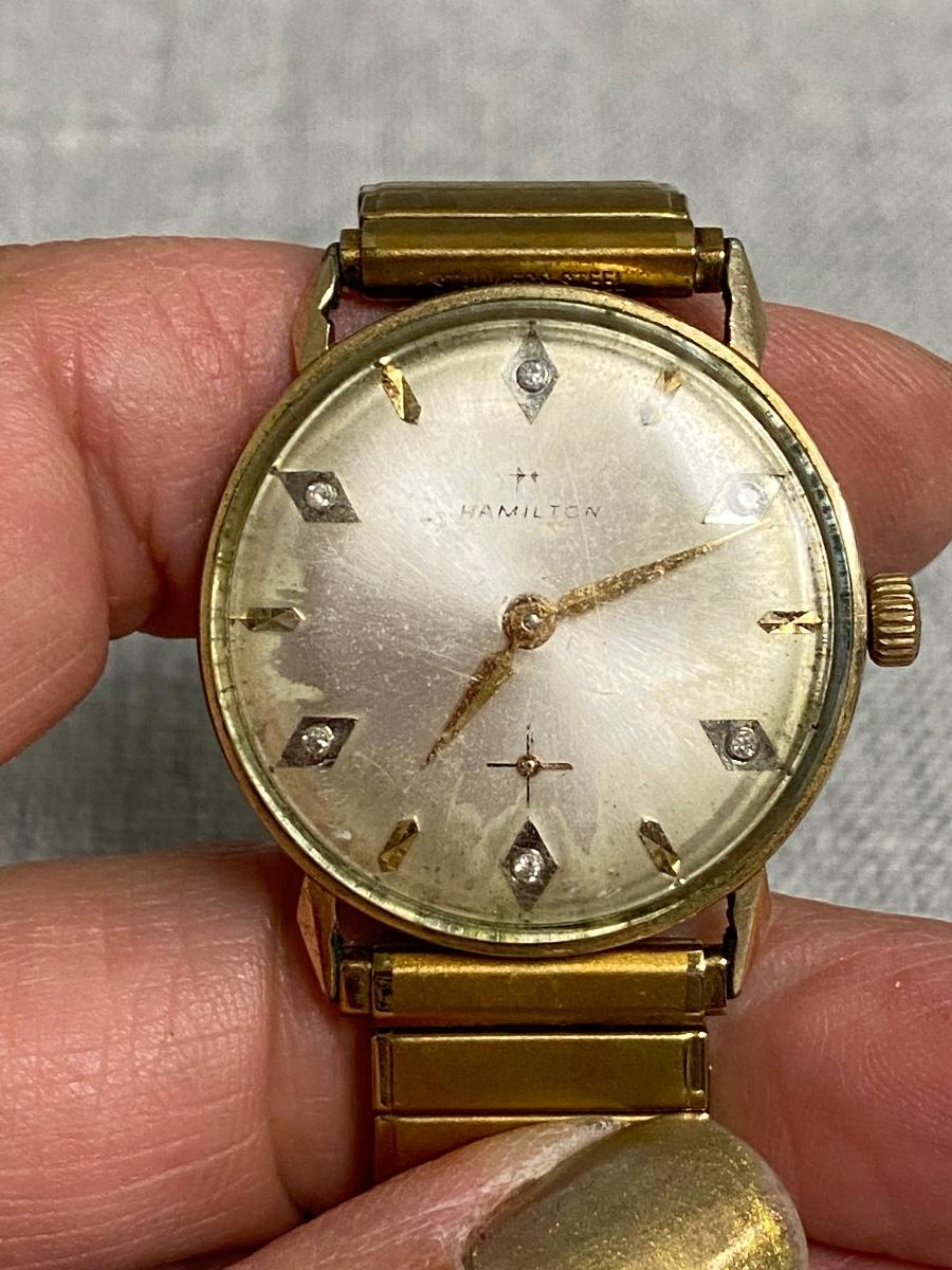 Vintage Men's Hamilton wind up watch. 10k yellow gold RGP setting. Some discolor to the face. Watch does work when wound, not sure how well it keeps time. Metal stretch band.