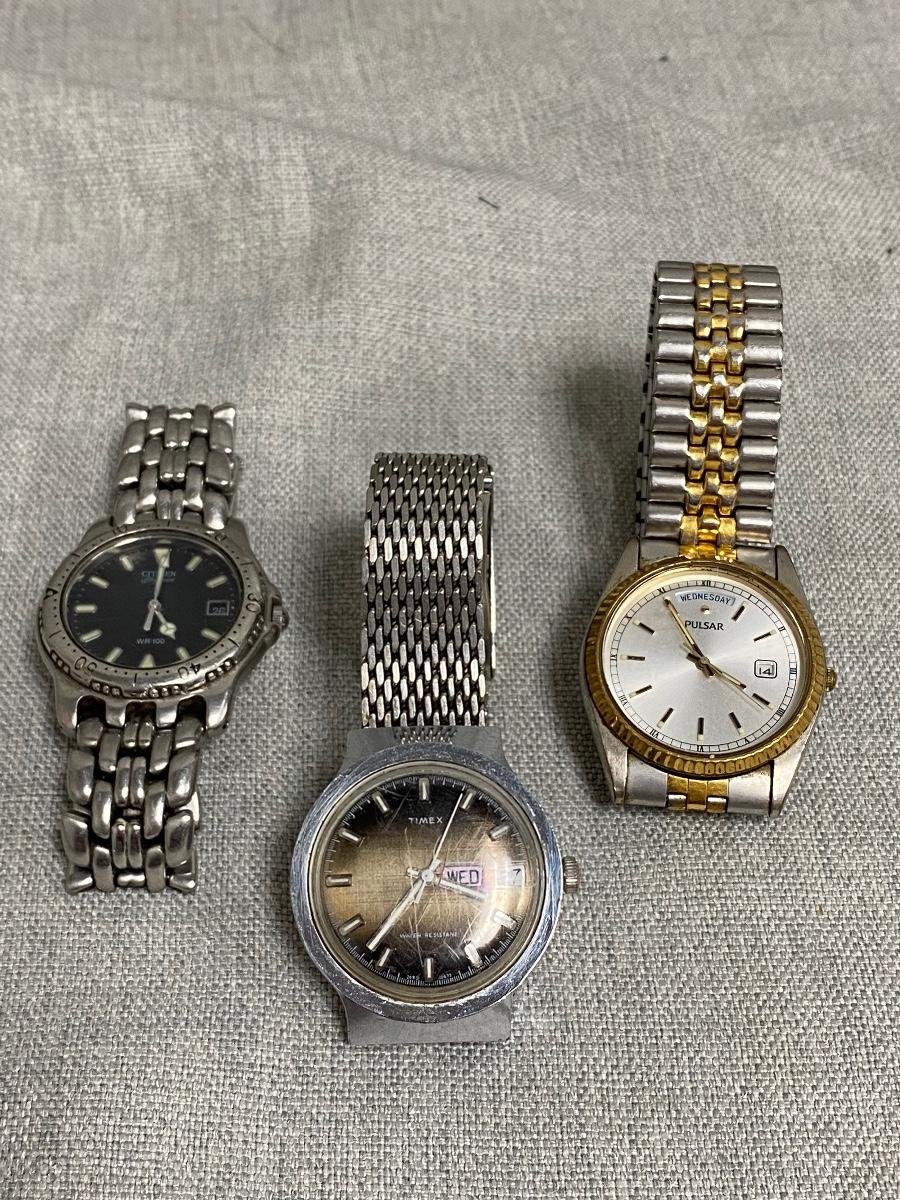 Set of 3 Men's Watches. Currently not running, may need new batter. Pulsar, Citizen, and Timex brand.