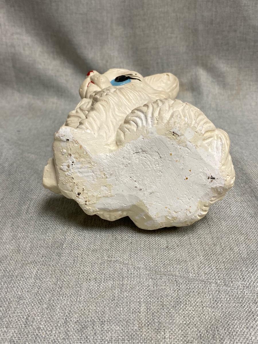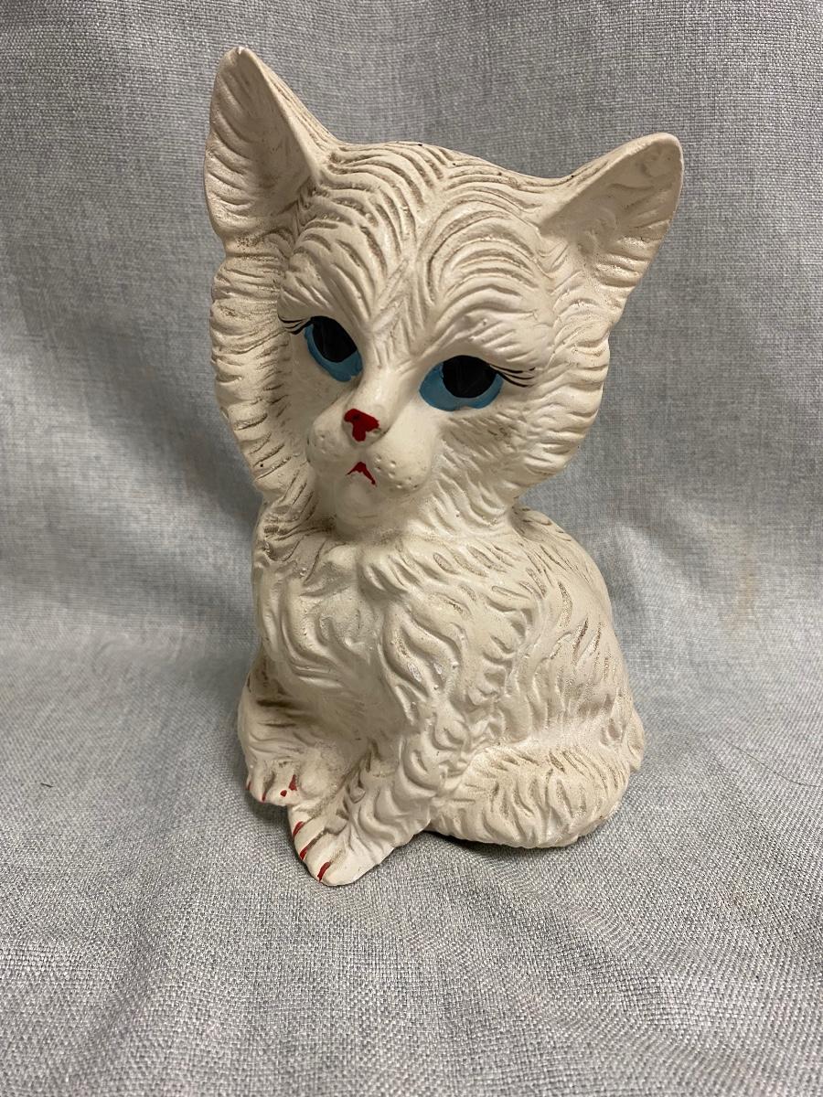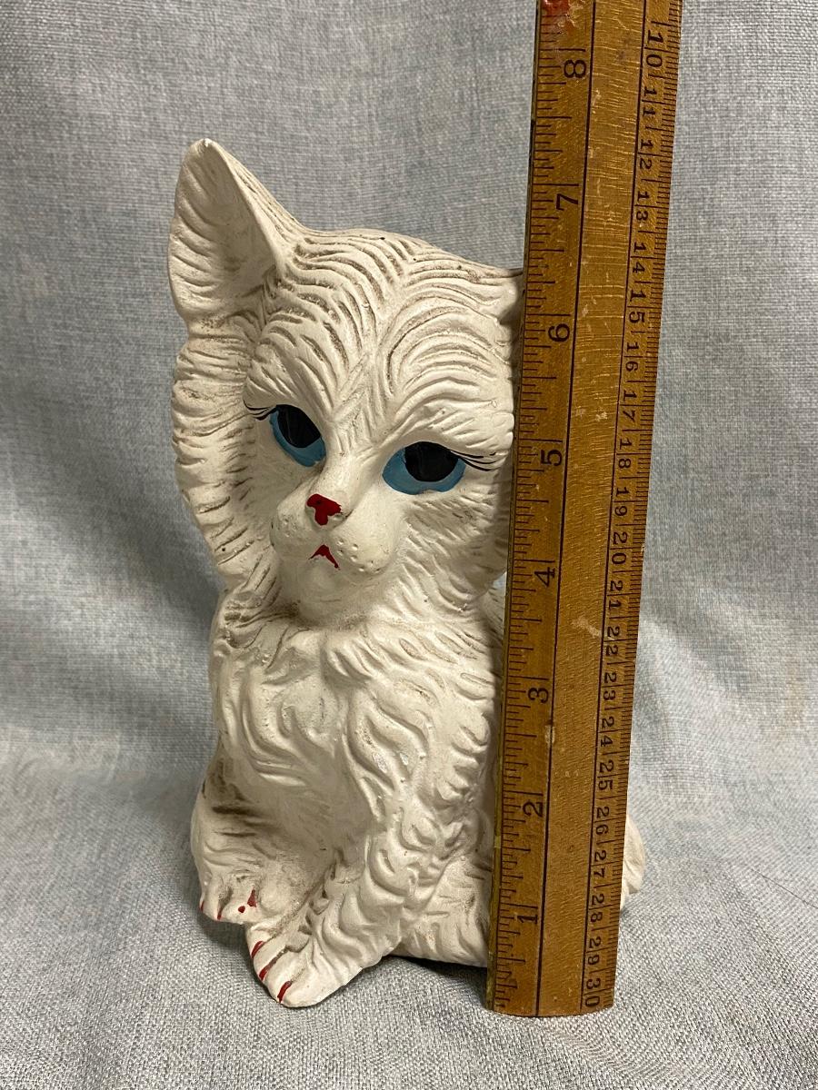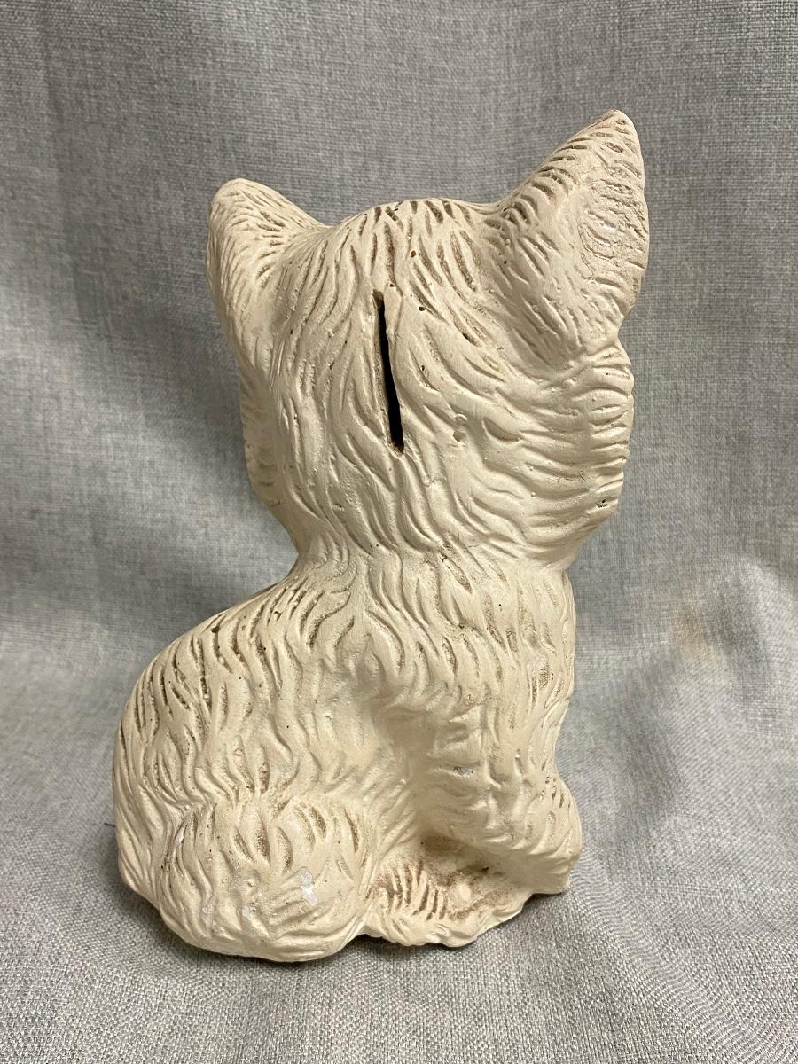 Vintage Cat Kitten Chalkware Coin Bank. No stopper in the bottom, does have coins inside, maybe about half full. Dusty from years on shelf but in otherwise good vintage condition.